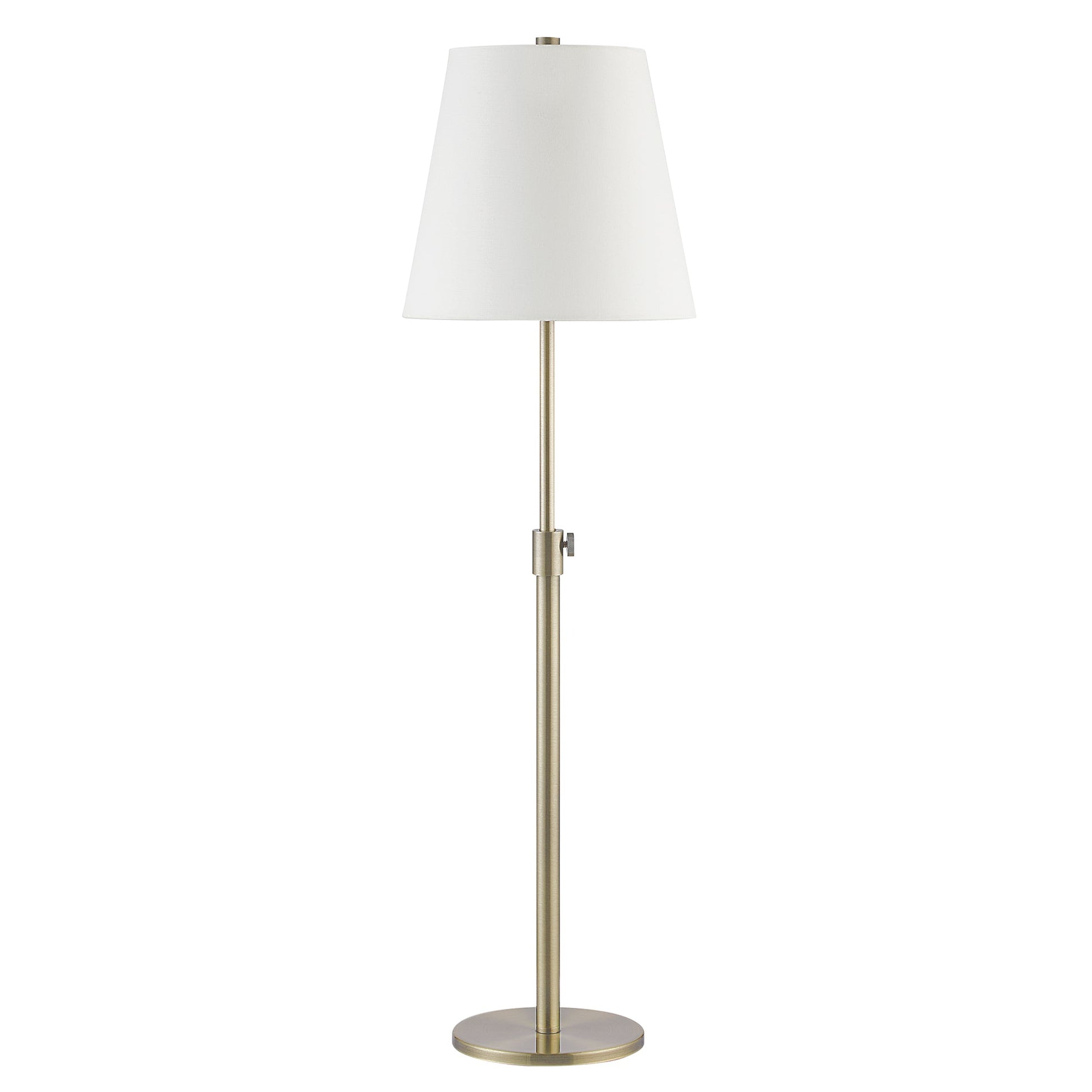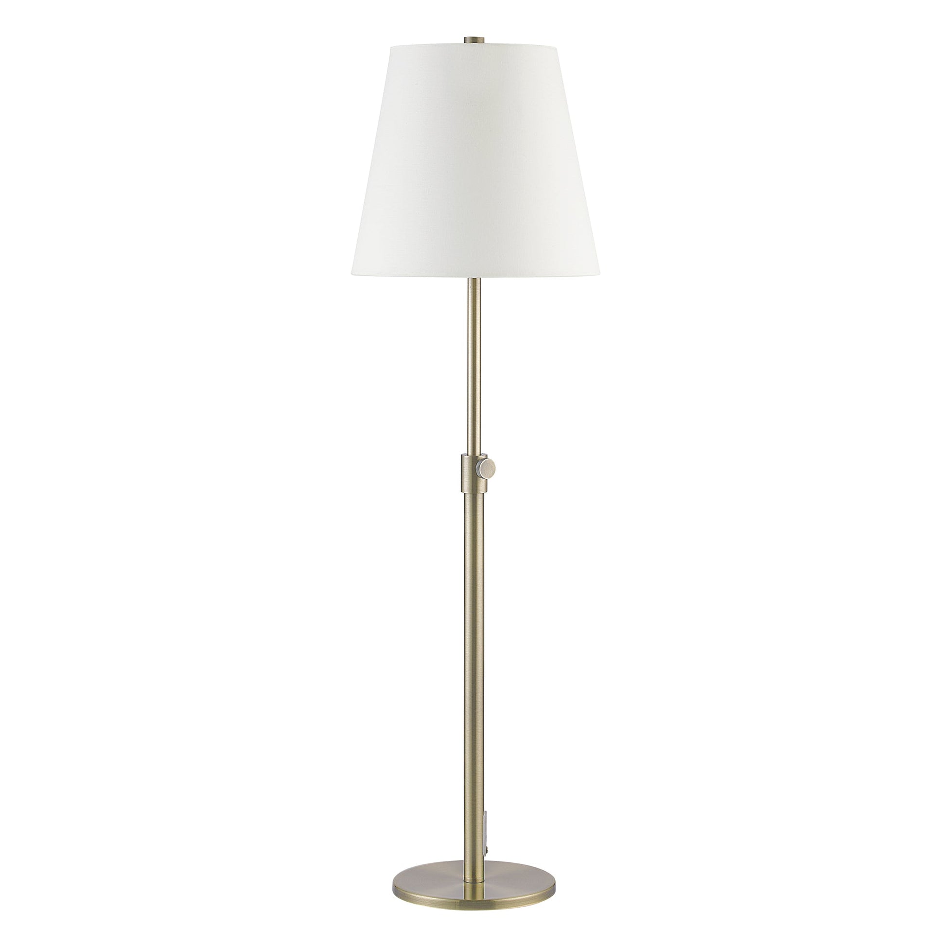 This mid-size table table lamp enhances reading rituals and moments of relaxation. Set alone in a living room or home office on a side table or desk, the sleek quality of this piece is balanced out by the comforting textures and tones of the room. With an antique brushed brass finish, this table lamp has the capability to fit within mid-century modern, contemporary and classic interiors alike.