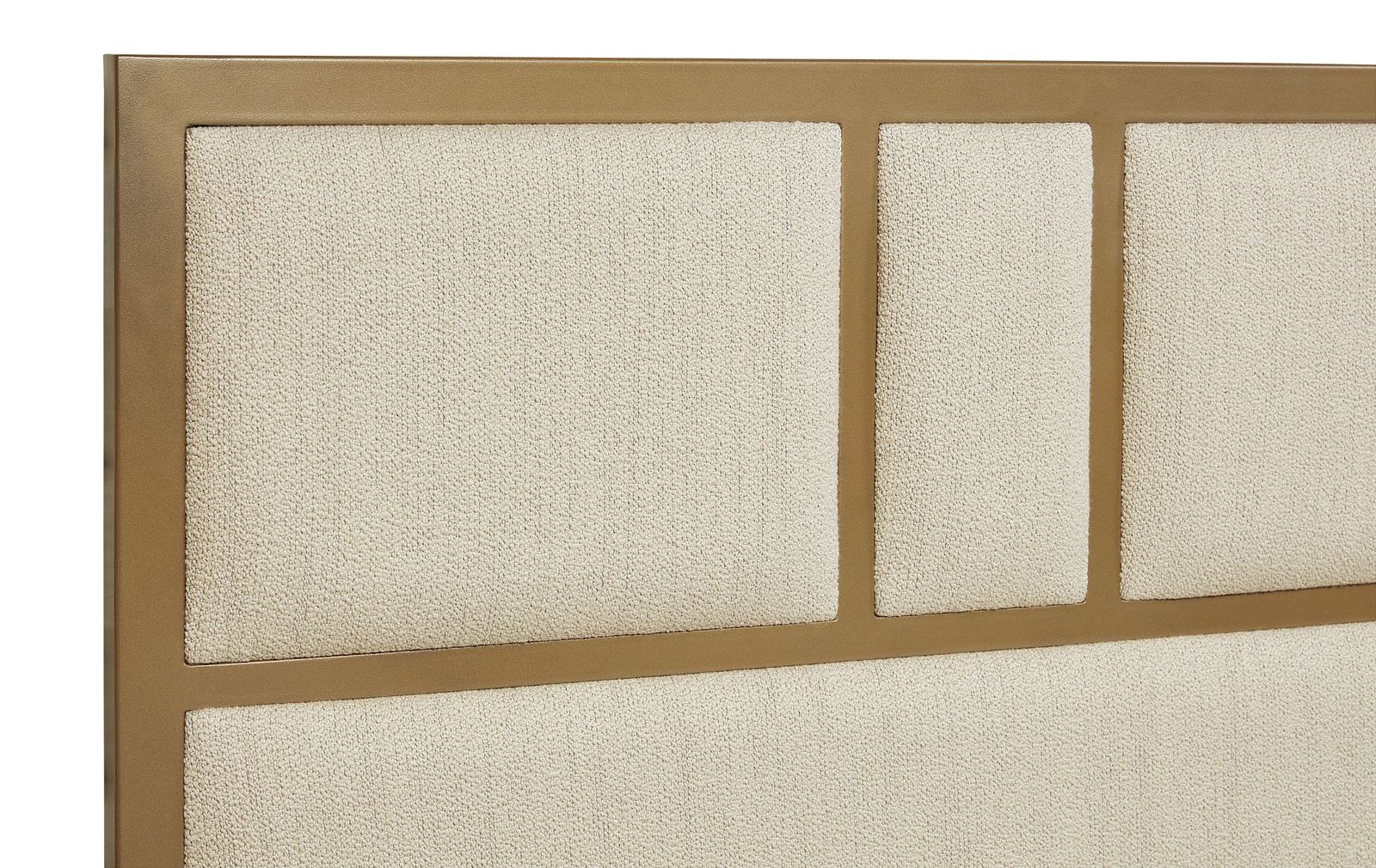 Exuding a refined style, this comfortable bed features a classic design that will add beauty to any bedroom space. The headboard is upholstered in our dazzle cream fabric with an eye-catching steel border and accents in a rustic bronze finish. Completed with a grey solid oak wood base. No box spring is required and slats are included. Pairs well with the Alvaro dresser and nightstand.