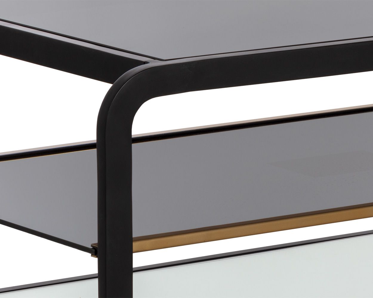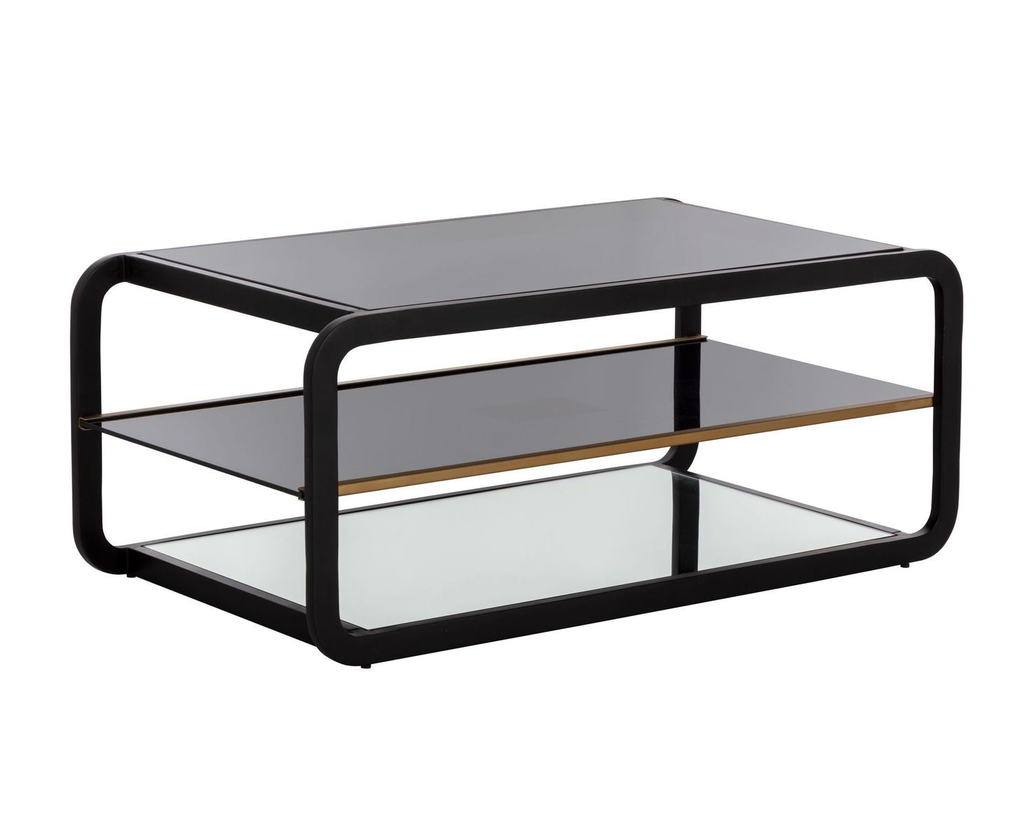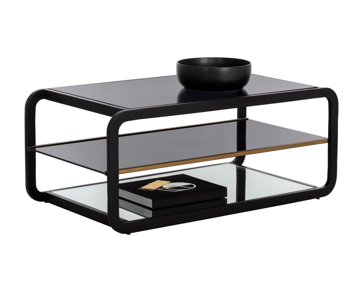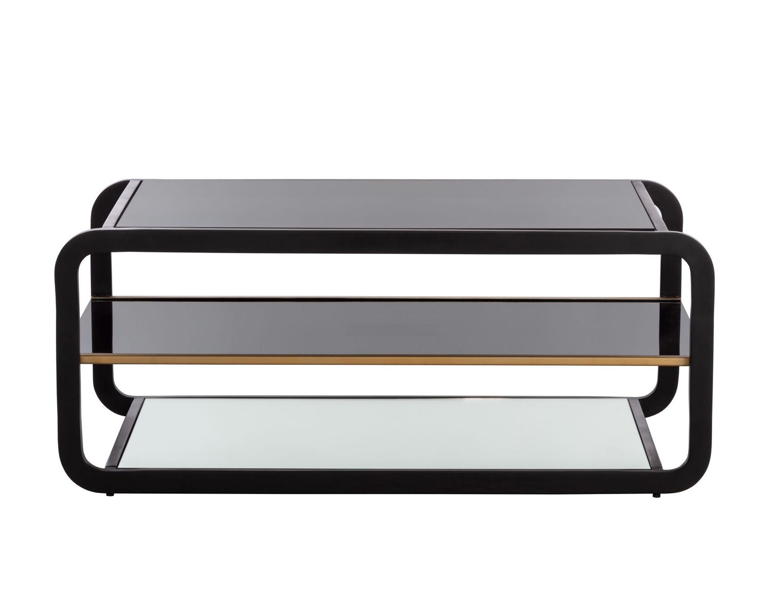This modern coffee table will bring elegance and sophistication to home office, living, lounge spaces and more. Features a smoked glass shelf with a brushed gold rail and a mirrored bottom shelf for ample storage. The design also features a round edge frame in black stainless steel. Coordinating bookcase and end table also available. Made in India: With refined craftsmanship, this design was brought to life by skilled local artisans. By nature, these materials develop unique imperfections such as fissures, markings and colour variations for a truly one-of-a-kind piece.