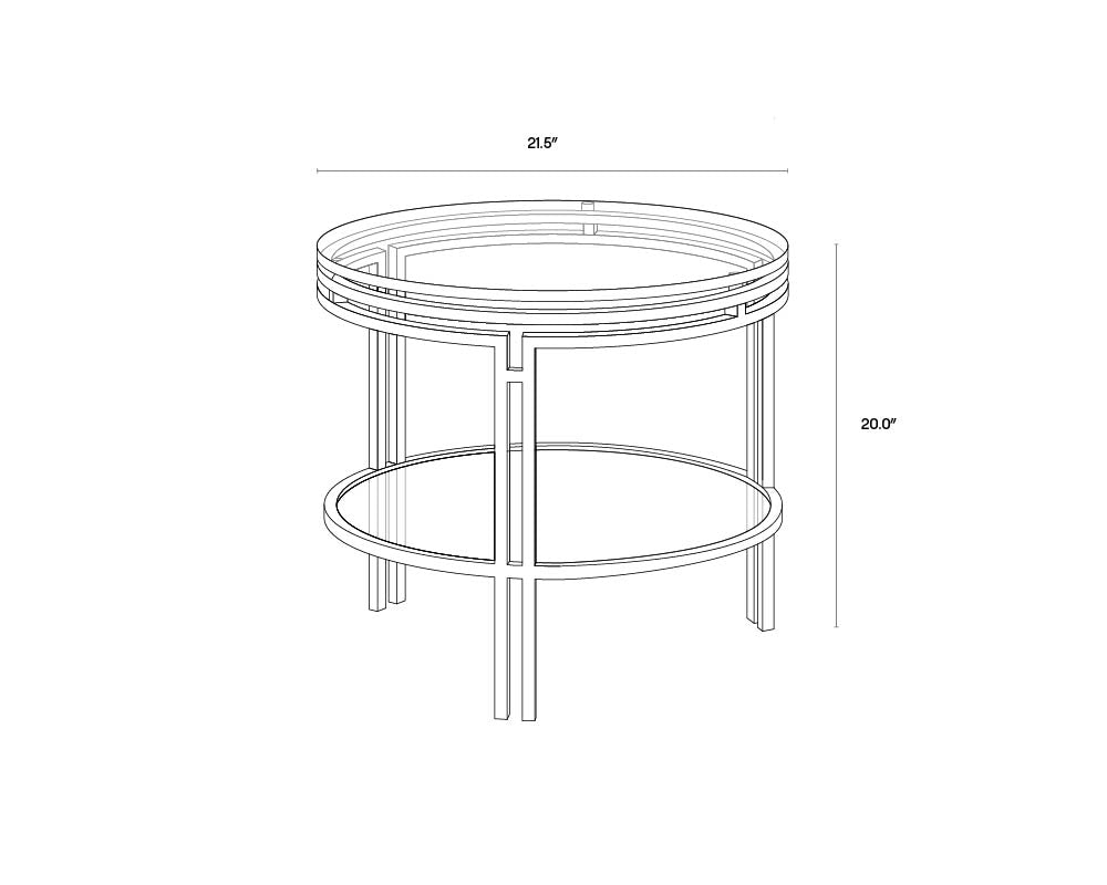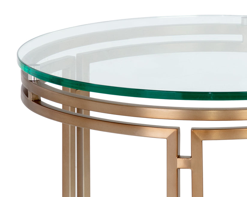 Defined by an intriguing art-deco design, this end table is sure to add elegance and function to any space. Features a tempered glass top and bottom shelf. Completed with a powder coated stainless steel frame in an antique brass finish. Matching coffee table also available. Also stocked in polished stainless steel.