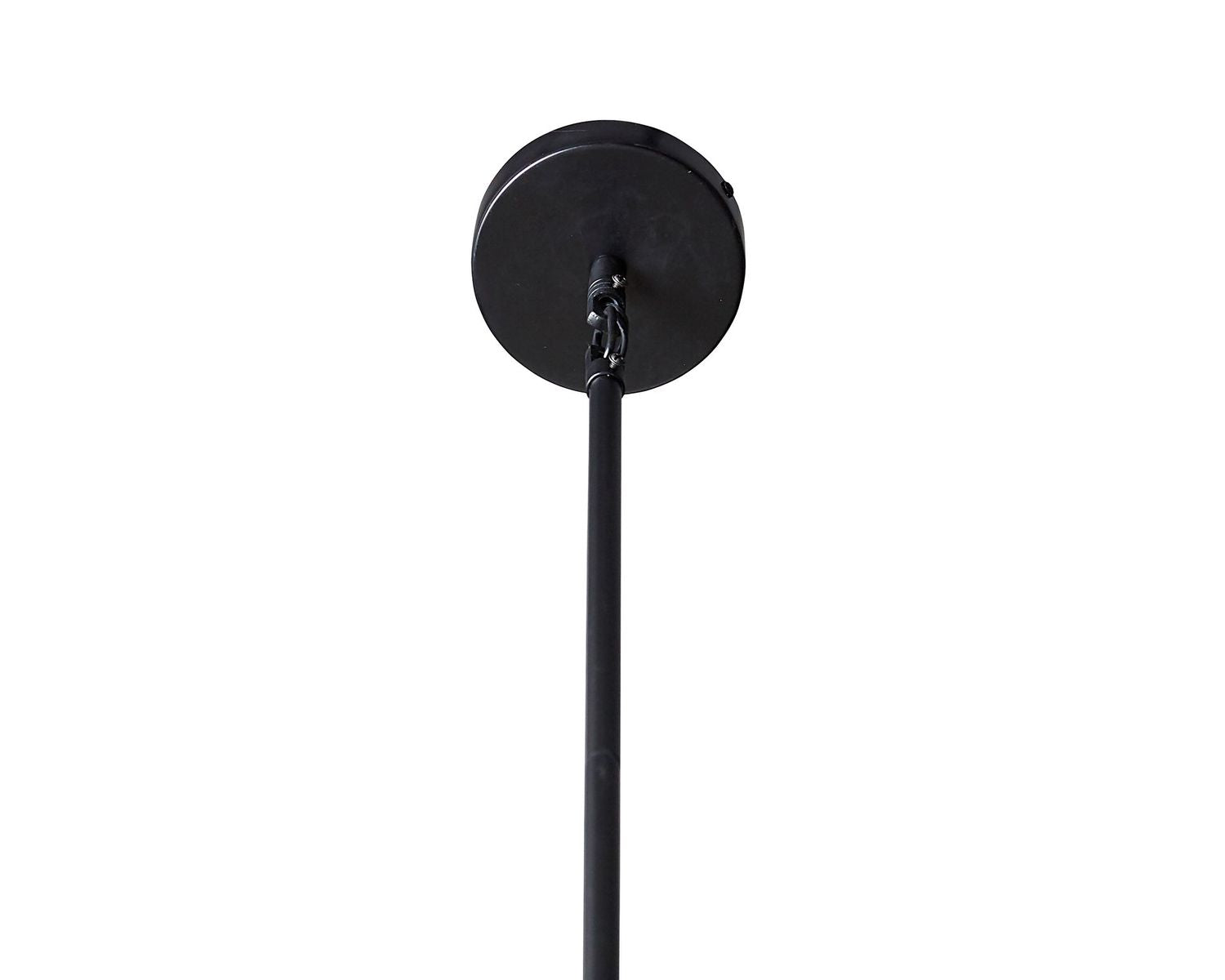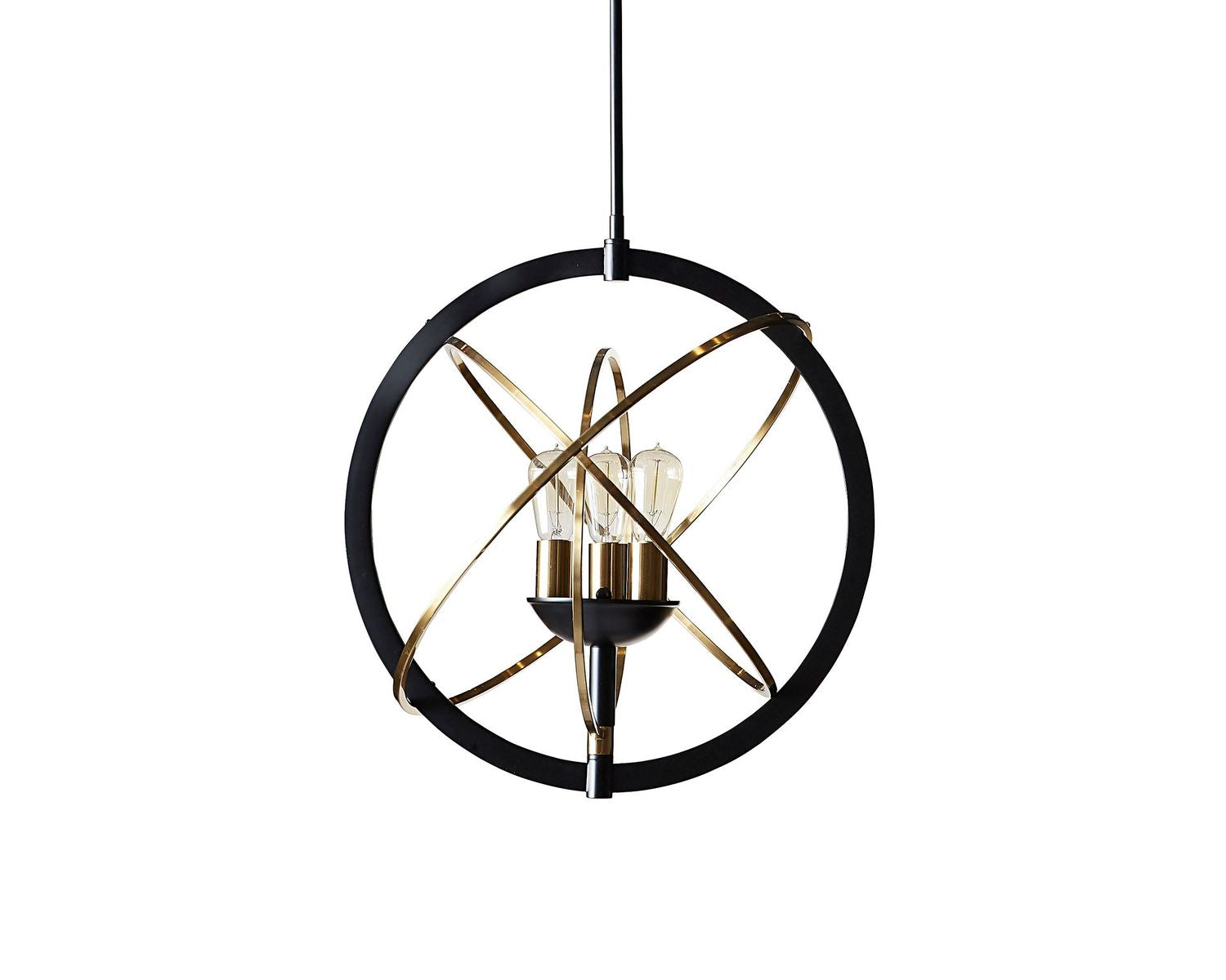 An eye-catching chandelier with a black iron ring frame. Also features three exposed brass iron sockets, orbited by three brass iron rings. Suspended with a black iron rod. Install in multiples for a dramatic effect.
