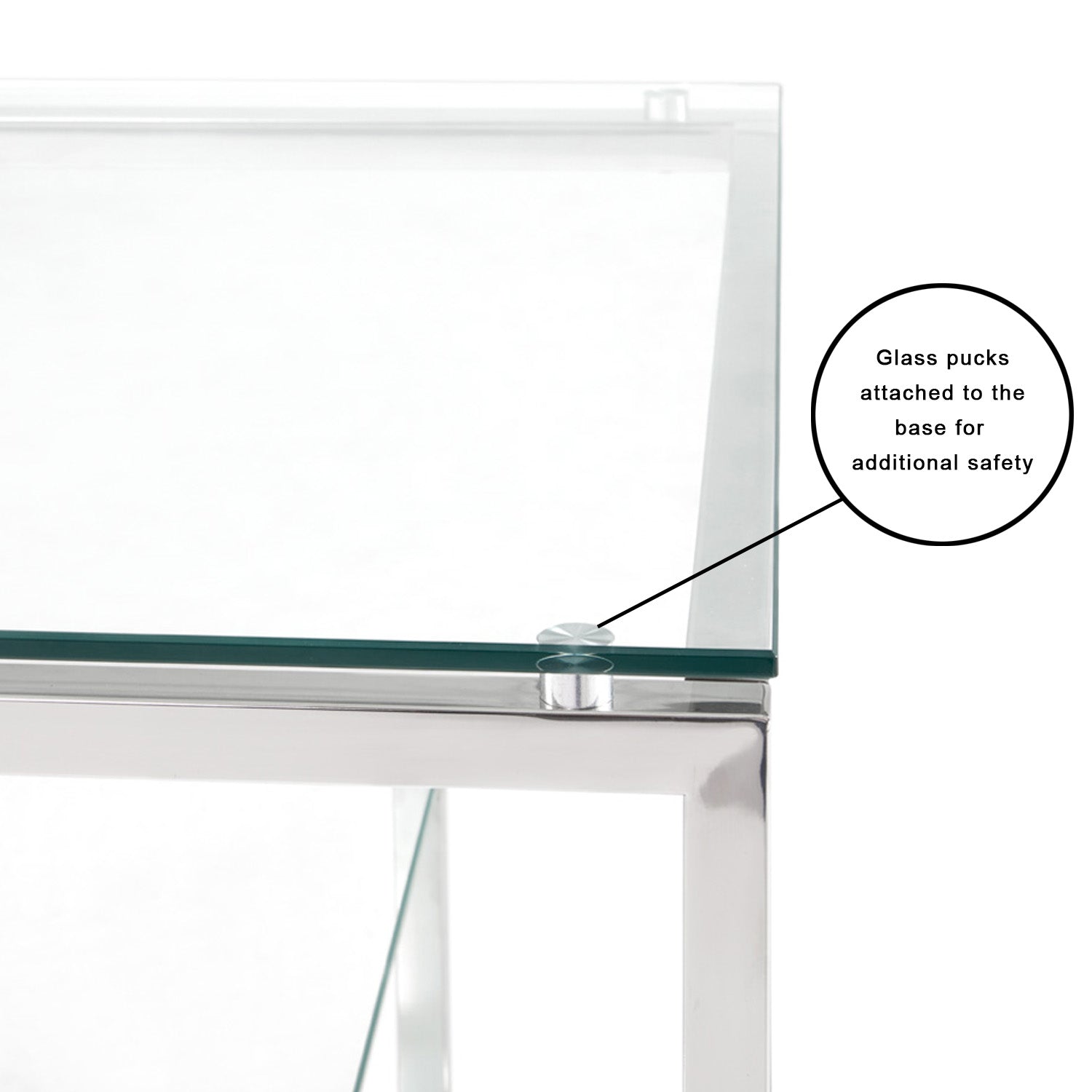 Simply chic. The Barolo console table offers up to five levels of tempered glass to achieve maximum storage and display space. The multi-level design adds layers and complexity to your living room space. Combined with a brilliant brushed gold stainless steel base, this coffee table offers more than just functionality. The notably open and contemporary design adds a touch of glamour to your interior design. Shop the entire Geneva collection for an easy solution to your home decor space.