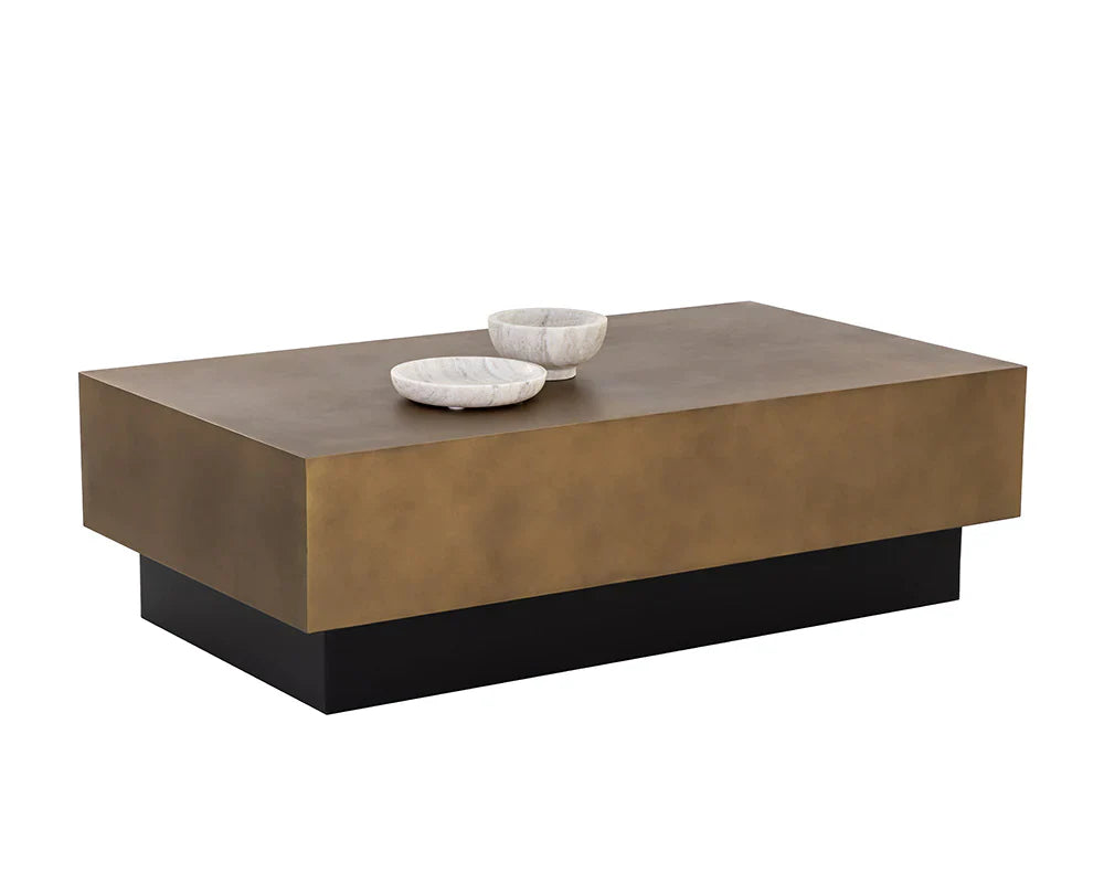 Turn heads with this contemporary, rectangular coffee table that features a bold design.Crafted with an antique brass steel top and a matte black powder coated steel base. Coordinating end table also available. Also comes in a gunmetal finish.