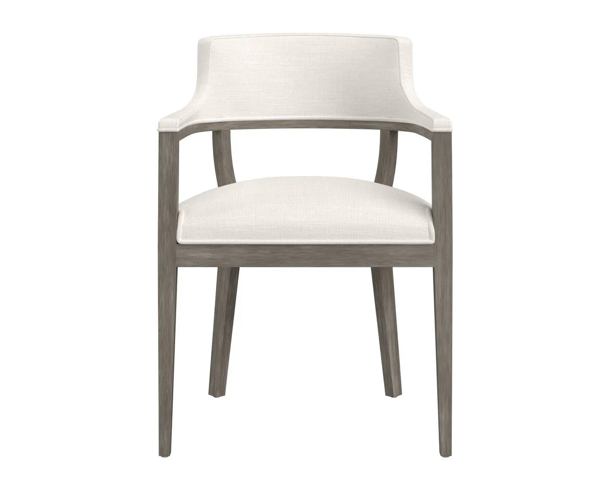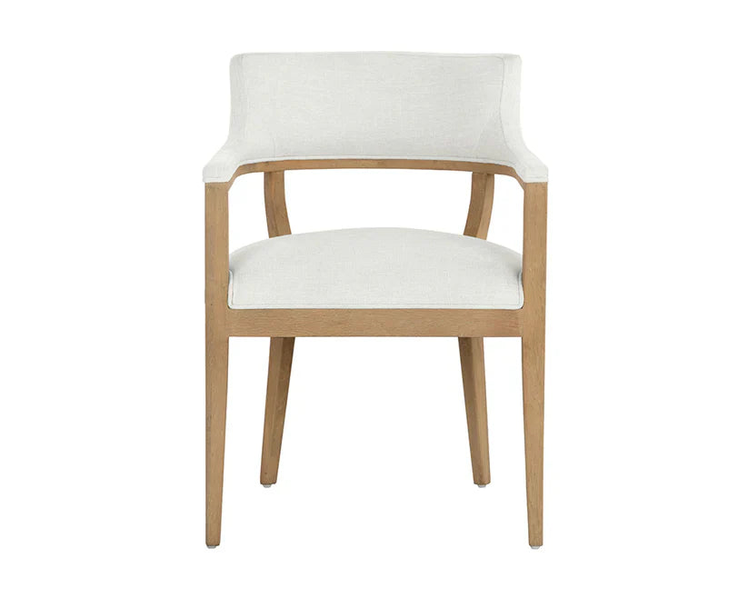 A mid-century modern dining armchair chair with an open back design. Stocked in linoso ivory fabric with an exposed ash grey solid oak wood frame. Also available in linoso light grey fabric with a dark brown oak frame, and in heather ivory tweed fabric with a natural oak frame. As wood is an organic, porous material, these pieces will contain natural variation of texture and may also exhibit fine indentations and cracks. Wood pieces will also display a disparity of colour and grain, and visible knots and burls that add to the character of each piece.