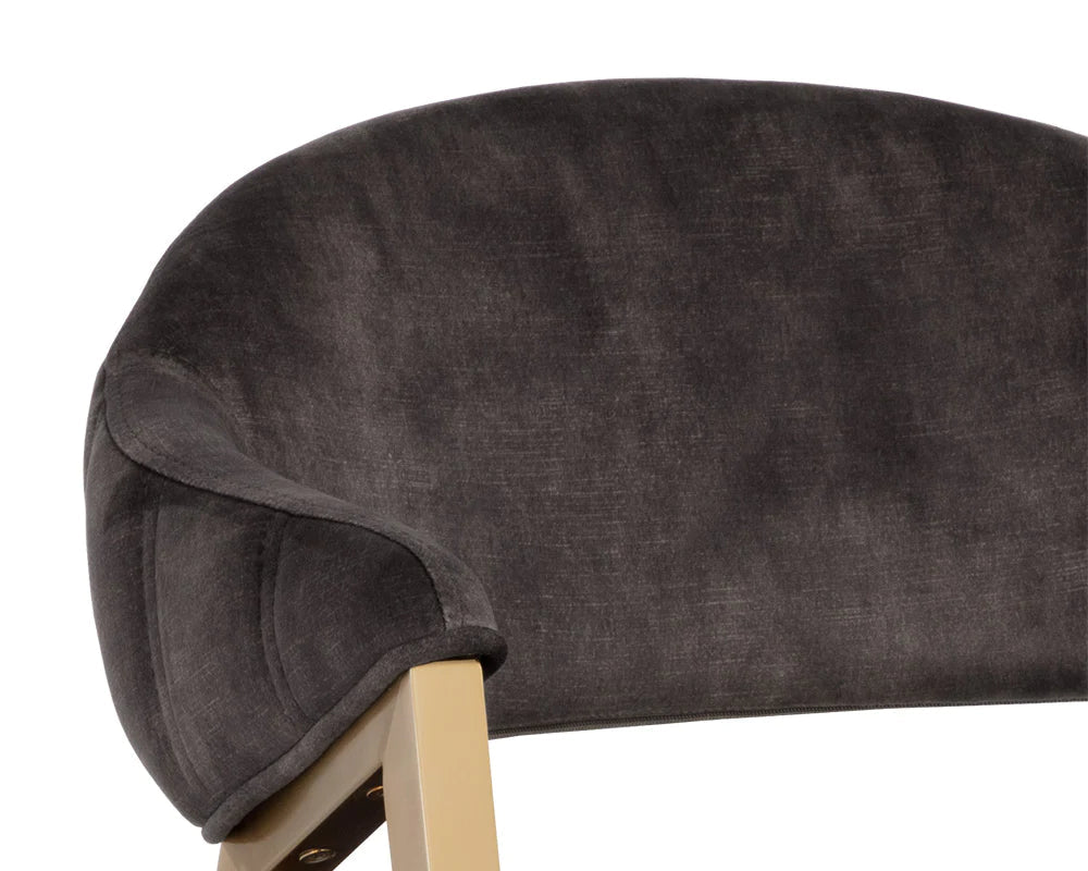 This modern chair will charm guests. Features a curved seatback with channel tufting on the exterior in belfast heather grey fabric, complemented with a brushed gold stainless steel frame.