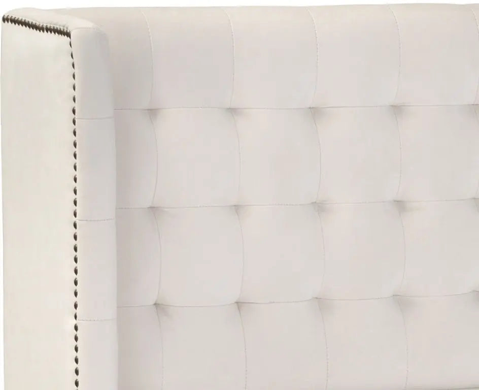 Drift to a blissful escape while resting in the Cairo bed. This design features deep tufting and a generously cushioned headrest for added comfort. Hand-hammered nail heads and antique brass legs complete the look. Stocked in antonio charcoal performance fabric. Performance fabric is moisture repellent, stain resistant and easy to clean. No box spring is required and folding slats are included.