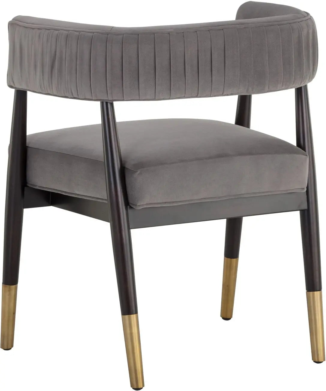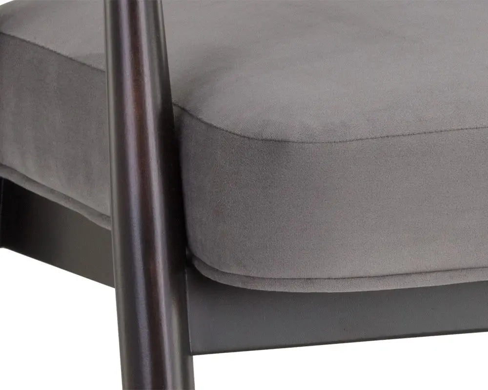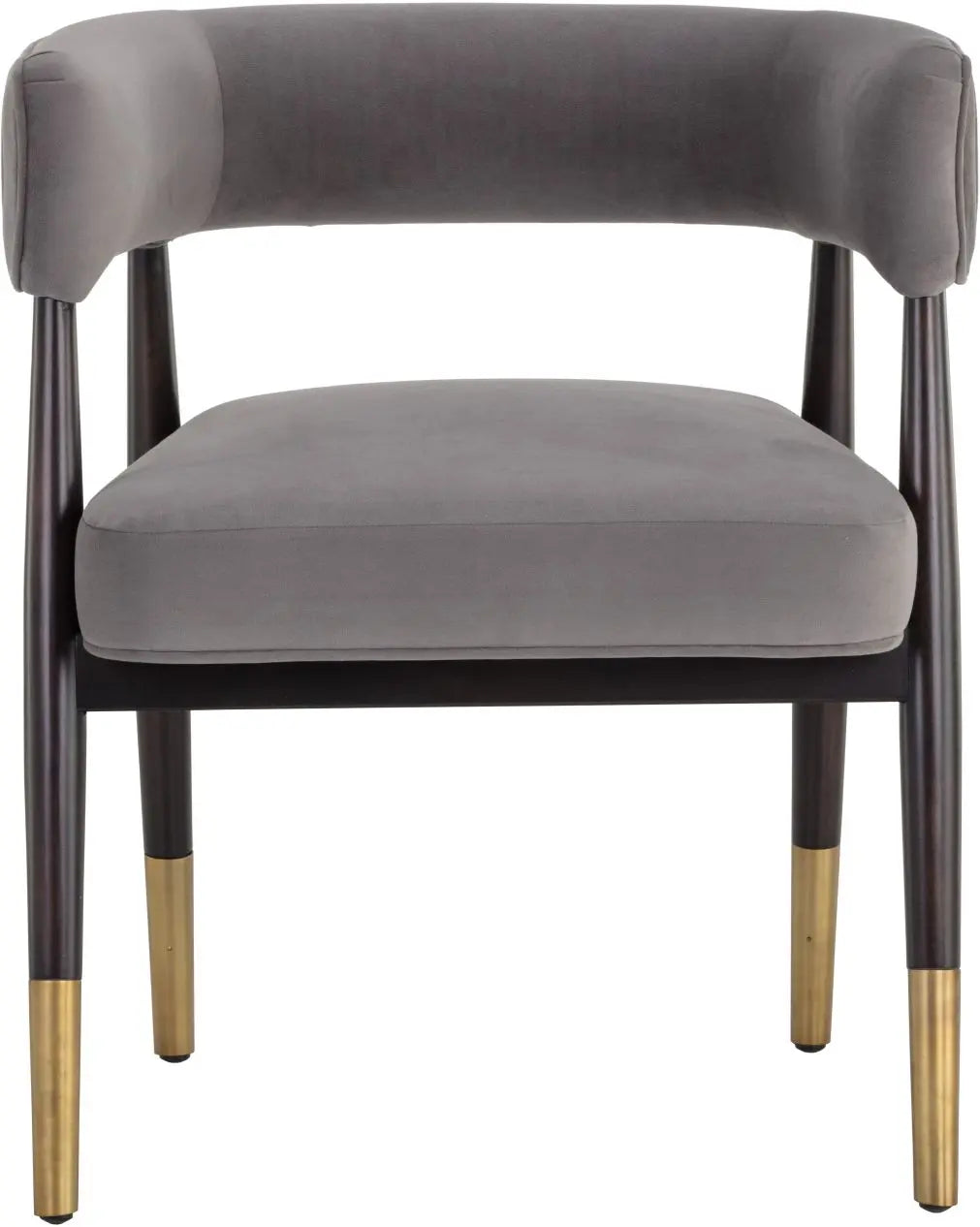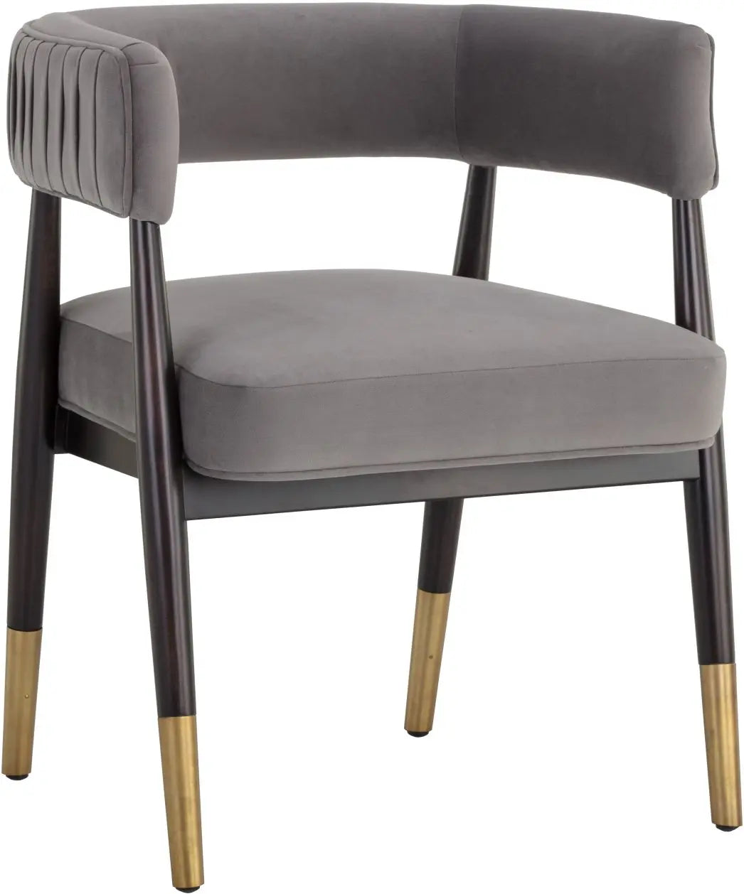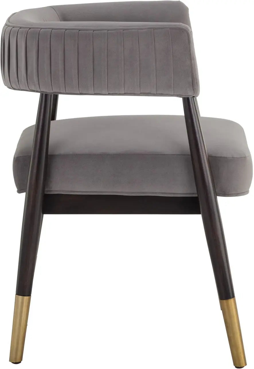 Invite guests to relax in this elegant open back armchair. Features a modern barrelback seat in antonio charcoal fabric with ruching on the exterior. An exposed brown birchwood frame with gold metal caps completes the look. Perfect for living, lounge and office spaces.
