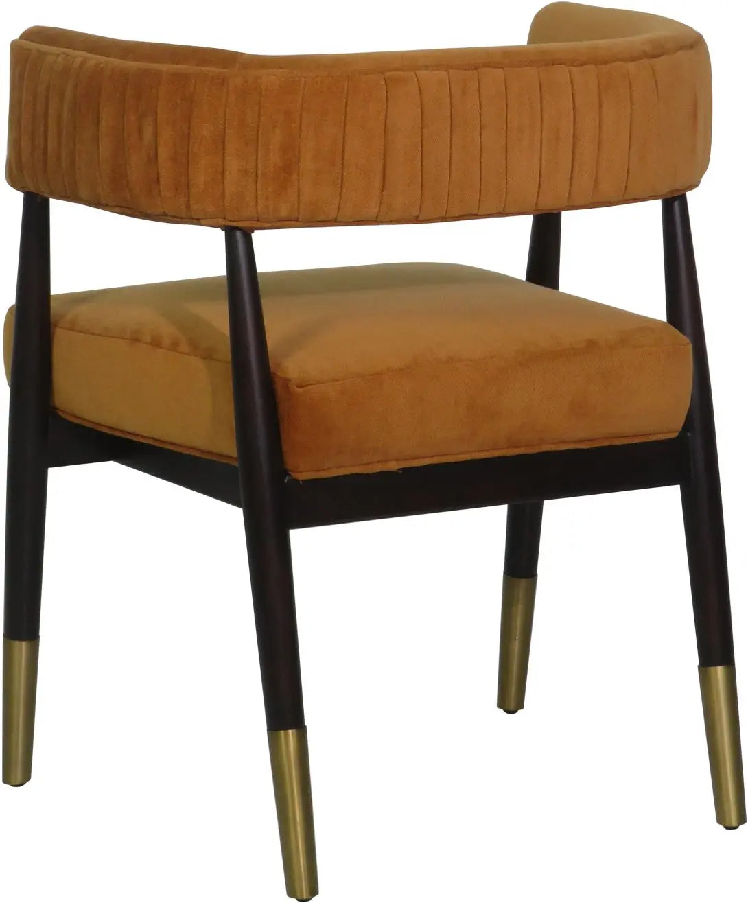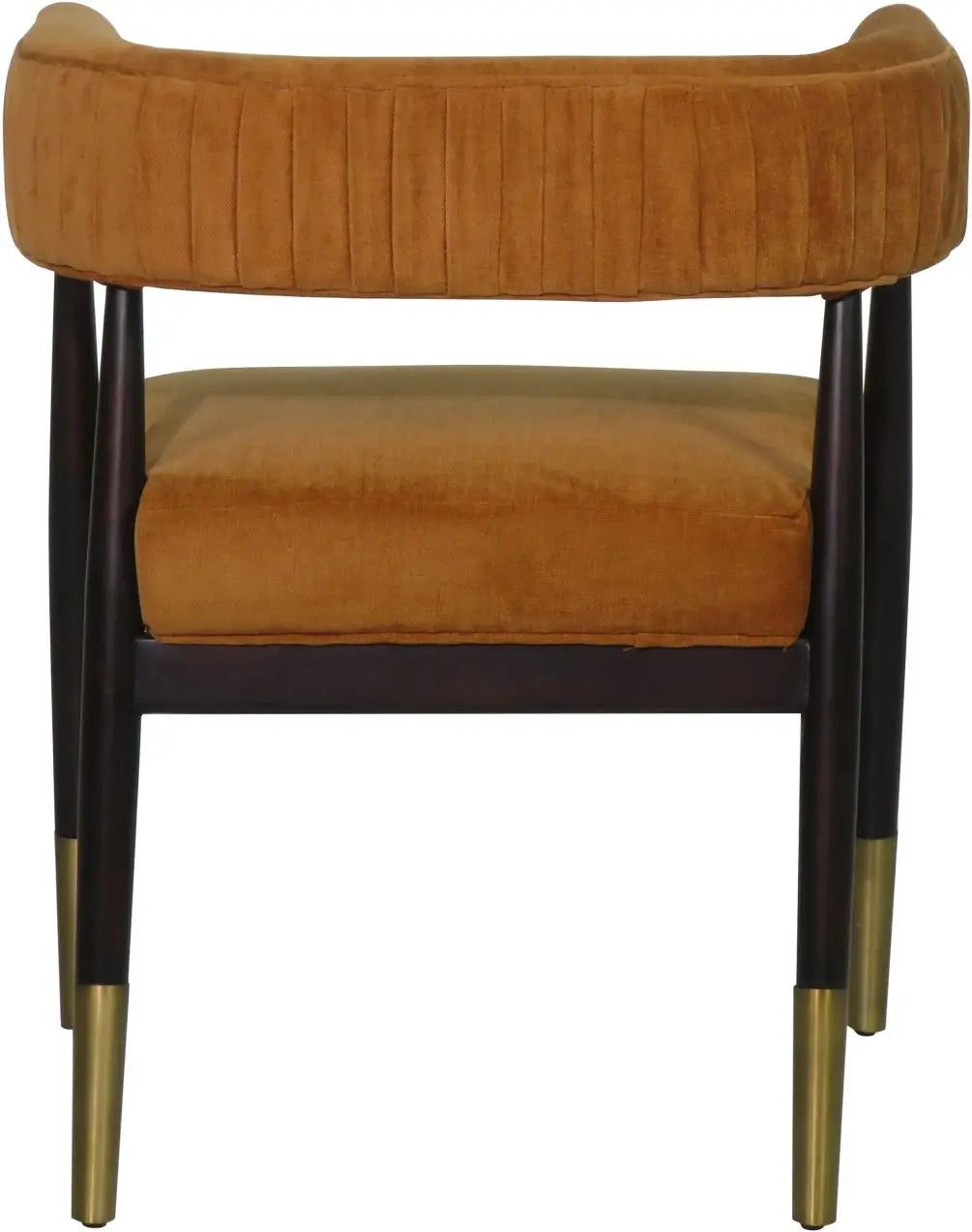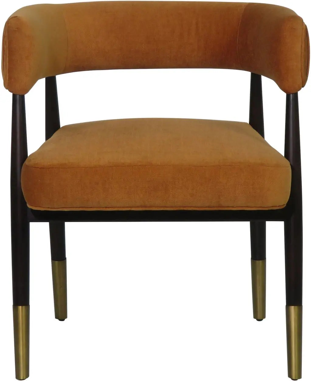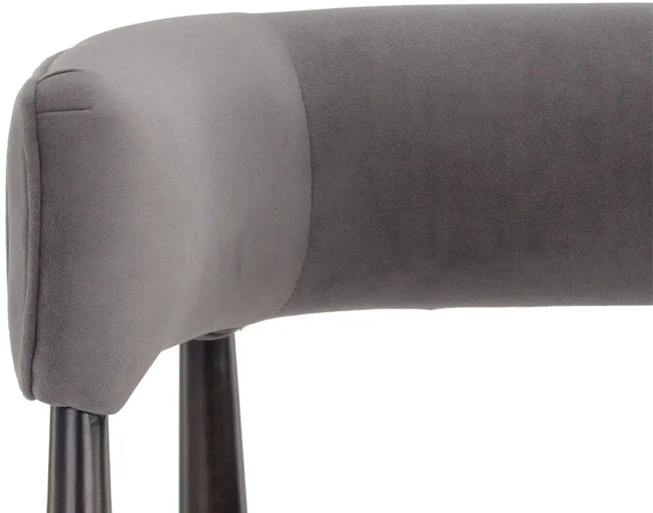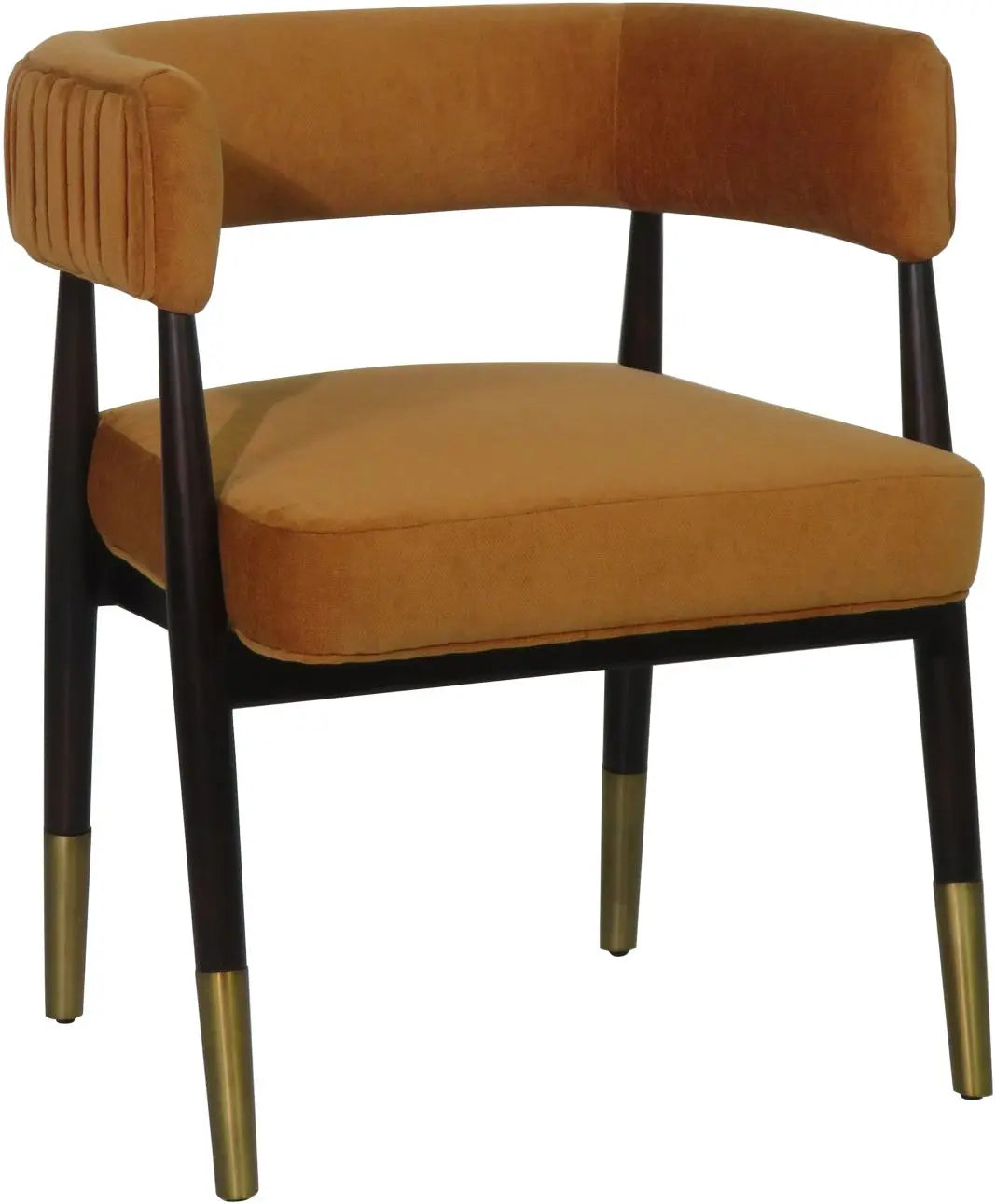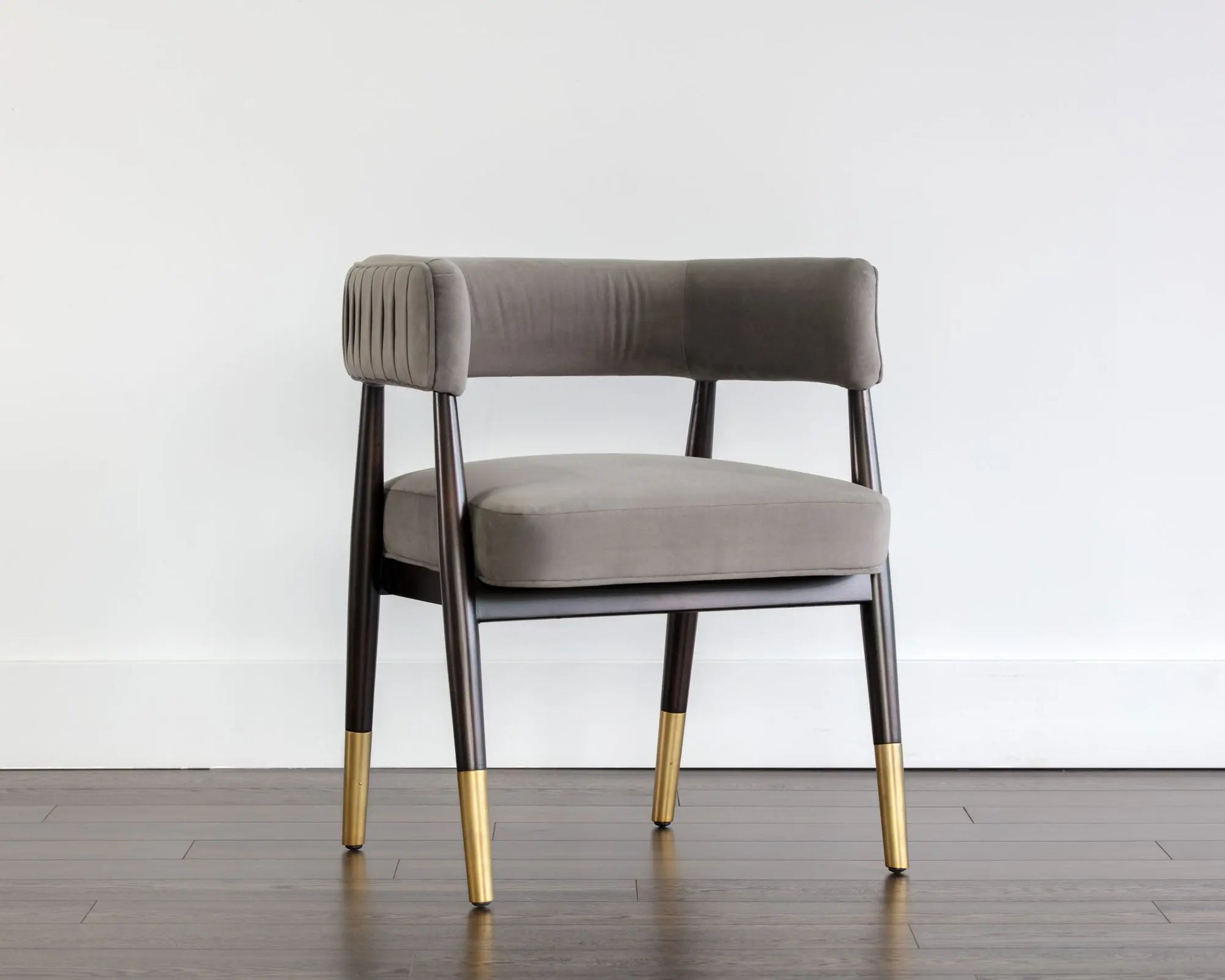 Invite guests to relax in this elegant open back armchair. Features a modern barrelback seat in antonio charcoal fabric with ruching on the exterior. An exposed brown birchwood frame with gold metal caps completes the look. Perfect for living, lounge and office spaces.