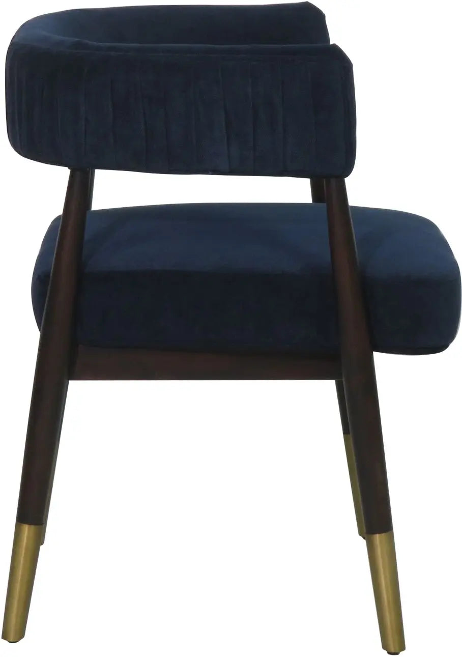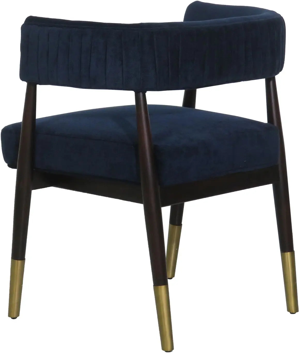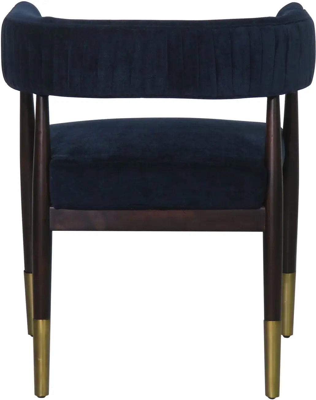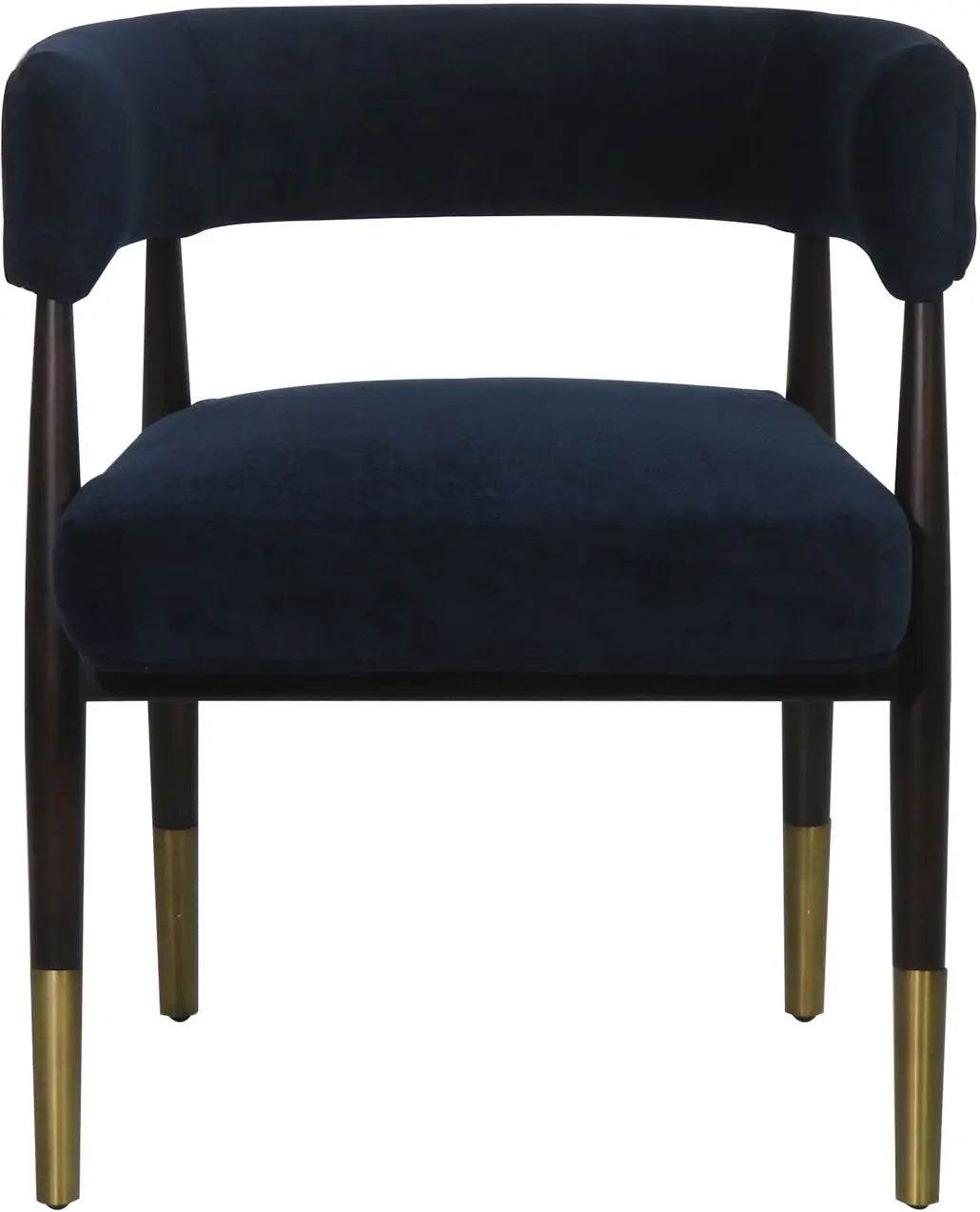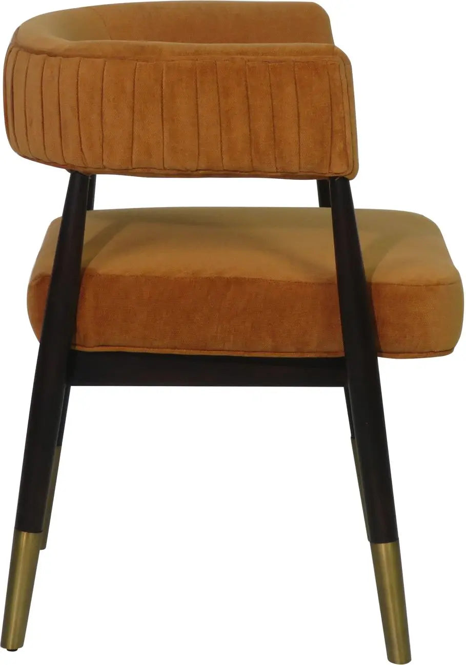 Invite guests to relax in this elegant open back armchair. Features a modern barrelback seat in antonio charcoal fabric with ruching on the exterior. An exposed brown birchwood frame with gold metal caps completes the look. Perfect for living, lounge and office spaces.