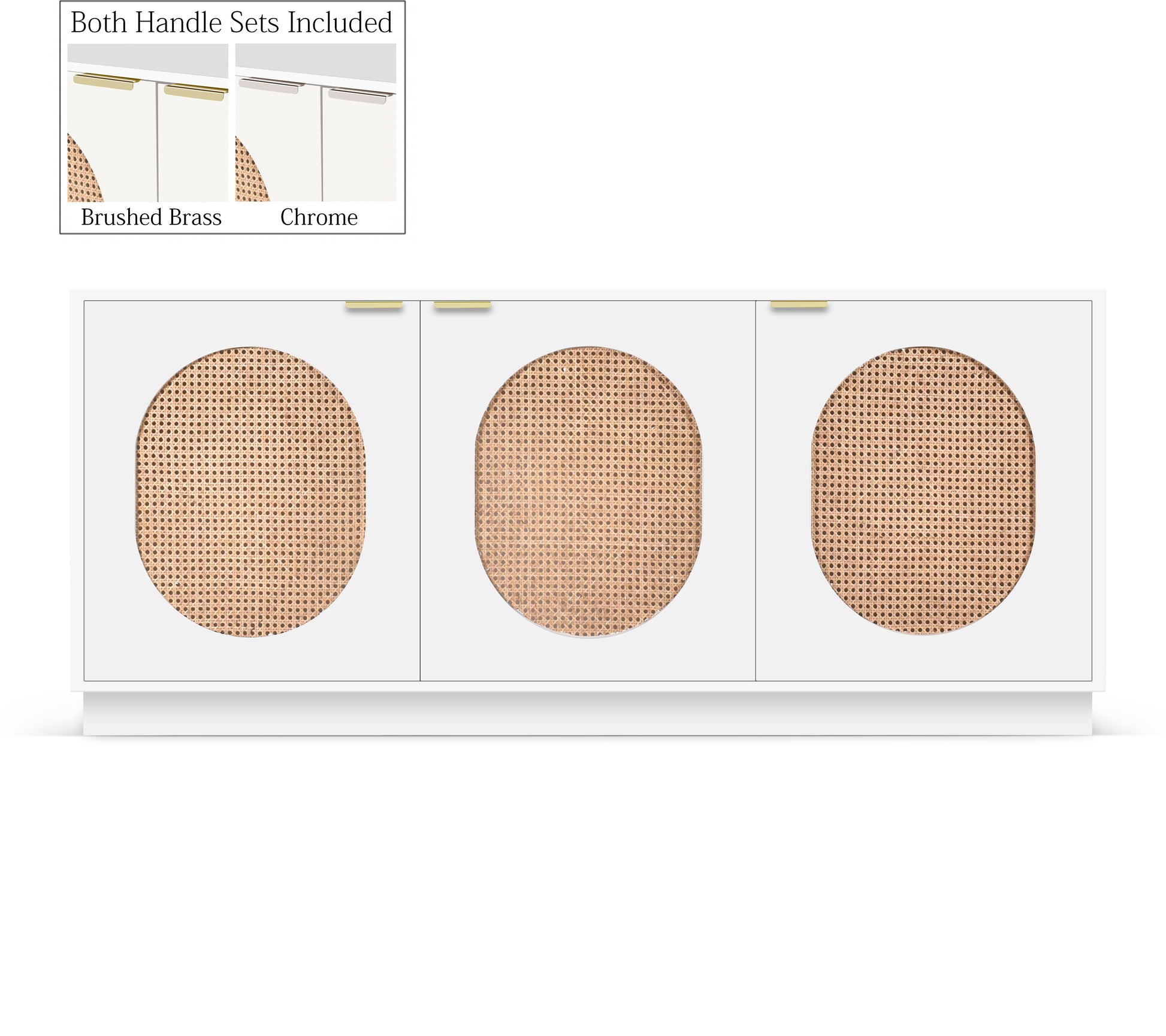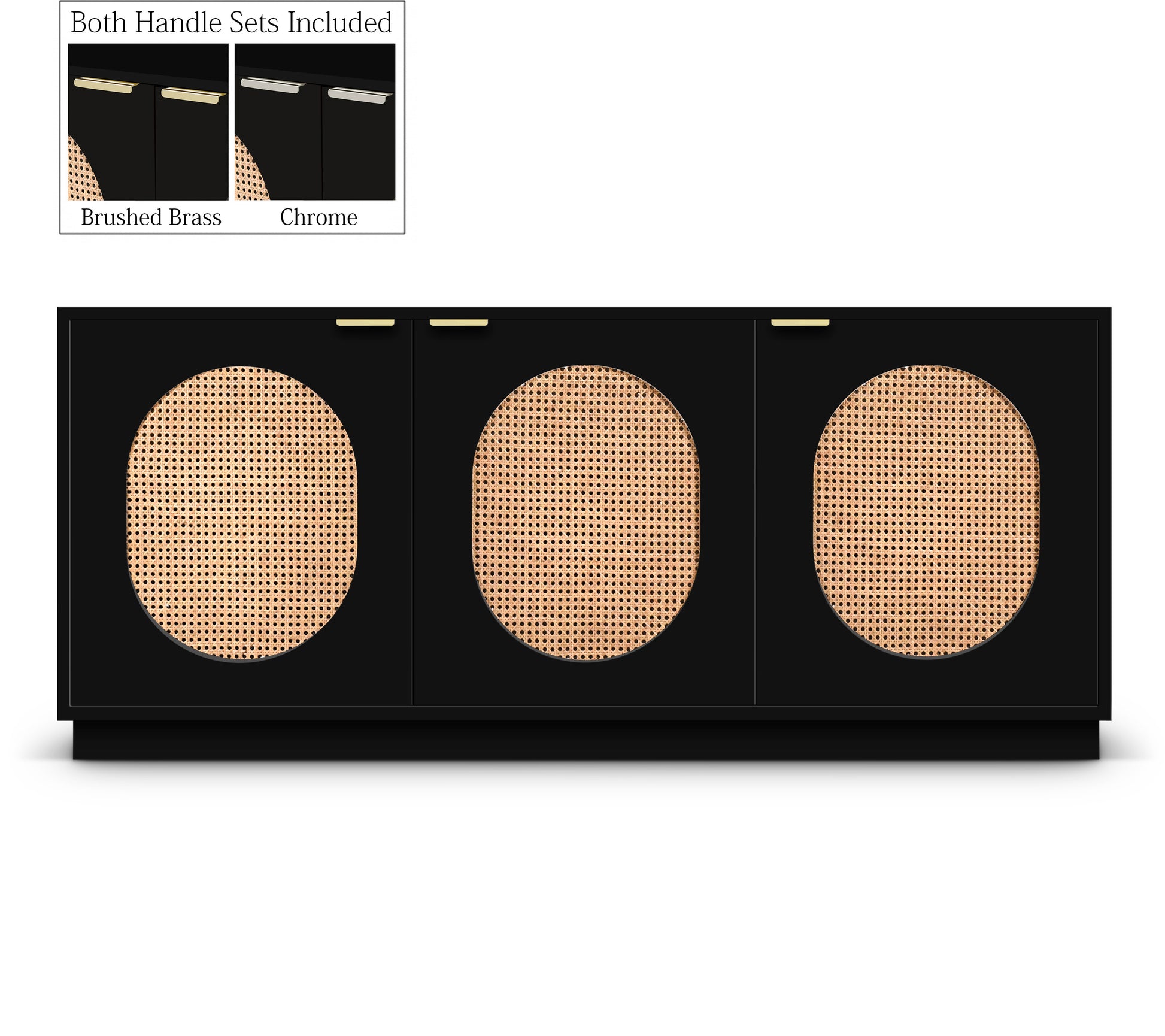 Provide extra storage space in your home with this elegant Cane sideboard/buffet from Meridian Furniture. Crafted from wood, steel, and natural cane, this buffet is sturdy enough to last for years. Its black and brushed brass finish gives it a bold appearance that is sure to catch the eyes of all who enter your home. It includes a complete set of brushed brass and chrome handles so you can decide which match your decor.