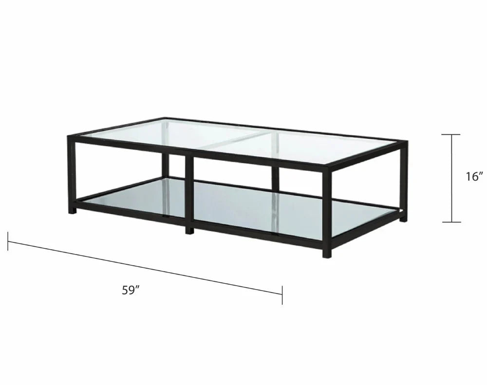 The exquisitely designed Caspian black metal rectangular coffee table draws attention to your living spaces. With its black metal frame and mirrored base, it creates a sleek and airy atmosphere, so even small spaces can look and feel fabulous. The rectangular design makes it ideal for narrow spaces. Instantly create a seamless living decor by featuring the entire Fabian black metal series which includes coffee, console, and end tables.