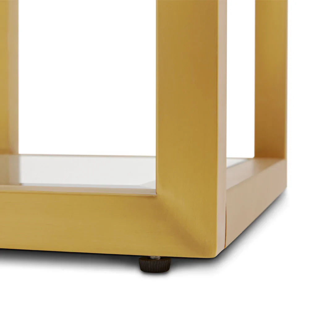 The exquisitely designed Caspian brushed gold console table instantly draws attention to your living spaces. With its hand-polished metal frame and mirrored base, it creates a sleek and airy atmosphere, so even small spaces can look and feel fabulous. Ideal for narrow spaces, foyer settings, or as an accent table placed behind the sofa to display your home decor. Instantly create a seamless living decor by featuring the entire Fabian series which includes coffee, console, and end tables.