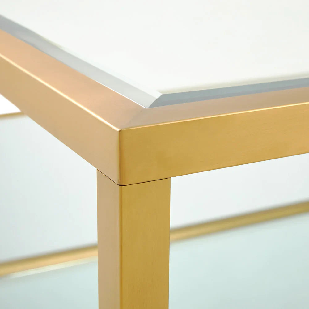 Peek-a-boo. The exquisitely designed Caspian coffee table draws attention to your living spaces. With its hand-polished brushed gold steel frame and mirrored base, it creates an open and airy atmosphere, so even small spaces can look and feel spacious. Instantly create a seamless living decor by featuring the entire Fabian series which includes coffee, console, and end tables.