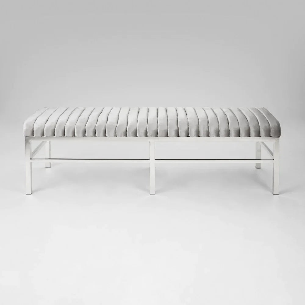 Fill in those blank spaces in your home decor with the stunning Chanel bench. Featuring classic clean lines and channel tufting, this rectangular bench with six strong and stable polished stainless steel legs adds a modern look to any of your decor. A polished stainless steel base is a subtle touch of glamour for your home decor needs.  Product DimensionsWeight (lbs) 40 Height (in) 18 Width (in) 60 Depth (in) 20 Shipping DimensionsWeight (lbs) 43 Height (in) 9 Width (in) 62 Depth (in) 22 *Dimensions may have a margin of error Features- Polished stainless steel base