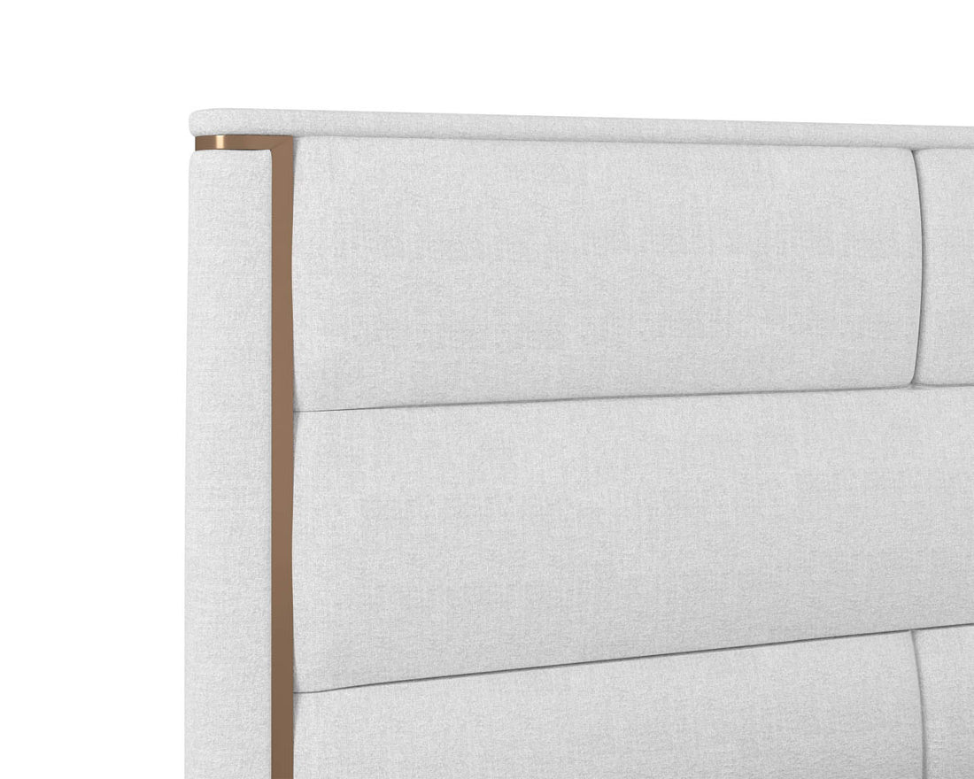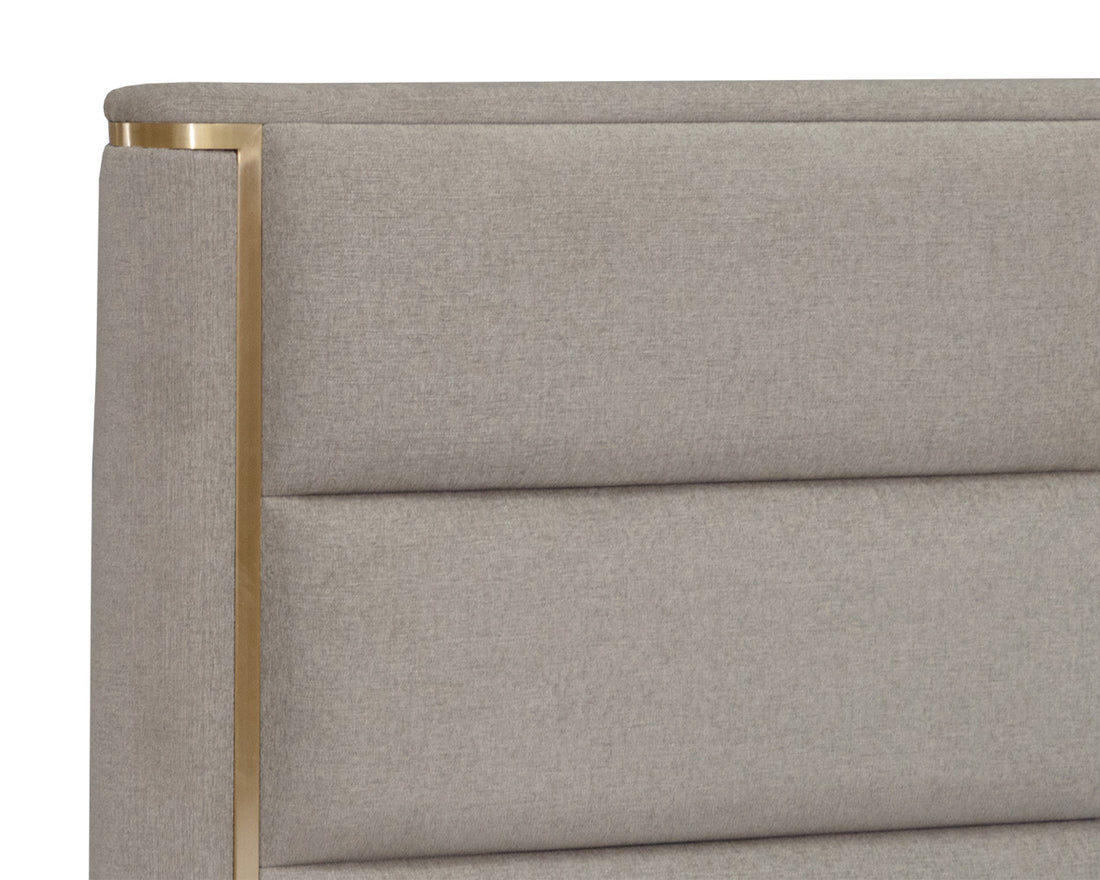 Contemporary flair is exuded with this luxurious bed. Upholstered in a ernst sandstone fabric with a tufting headboard, and yellow gold steel accents along the sides and feet. No box spring is required and folding slats are included. Due to the reflective nature of metal, some images on our website may not capture the artisanal characteristics of a product accurately.