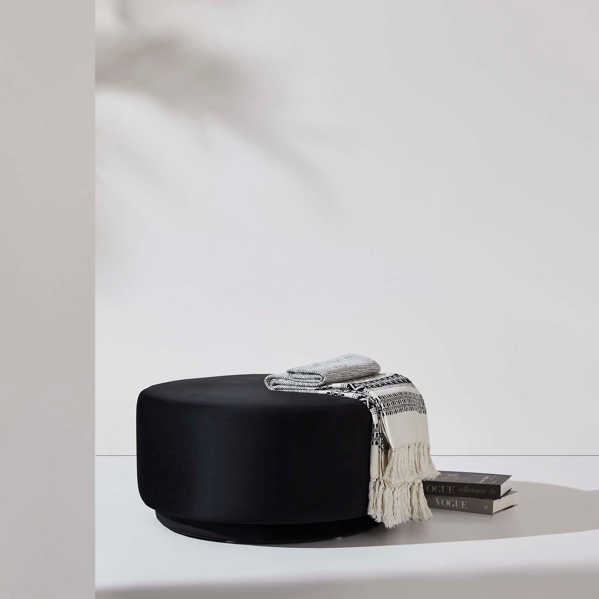Effortless elegance is captured within this ottoman design and poured out into the bedroom or living room. With a poly-velvet black finish, this piece is soft to the touch and has a naturally inviting vibe. Capable of holding decorative trays, acting as a footrest or serving as a seat, this ottoman can serve many different purposes within a day.