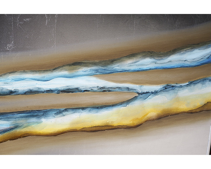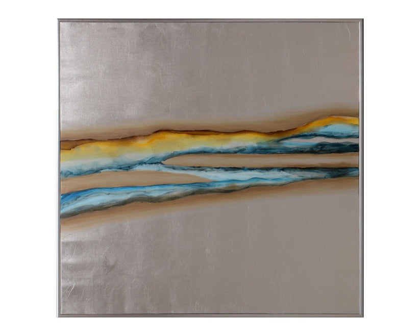 Organic hues paired with the silver background create an exciting painting, similar to a discovery of organic minerals. Features a silver floater frame.