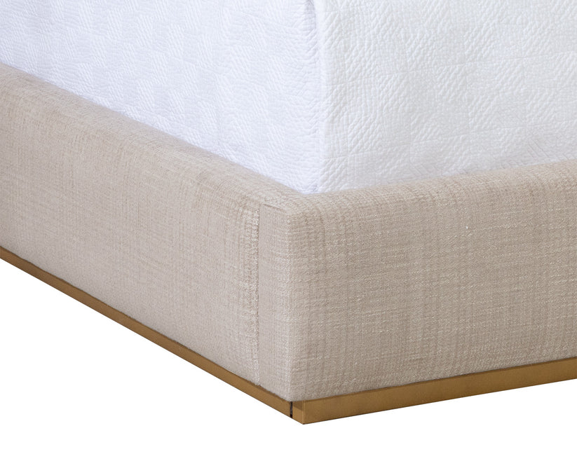 Polished and sleek, this bed boasts a stellar modern design that is full of comfort. Upholstered in naya check cream fabric and features stylish rustic bronze steel accenting. Pairs well with the Danbury dresser and nightstand.