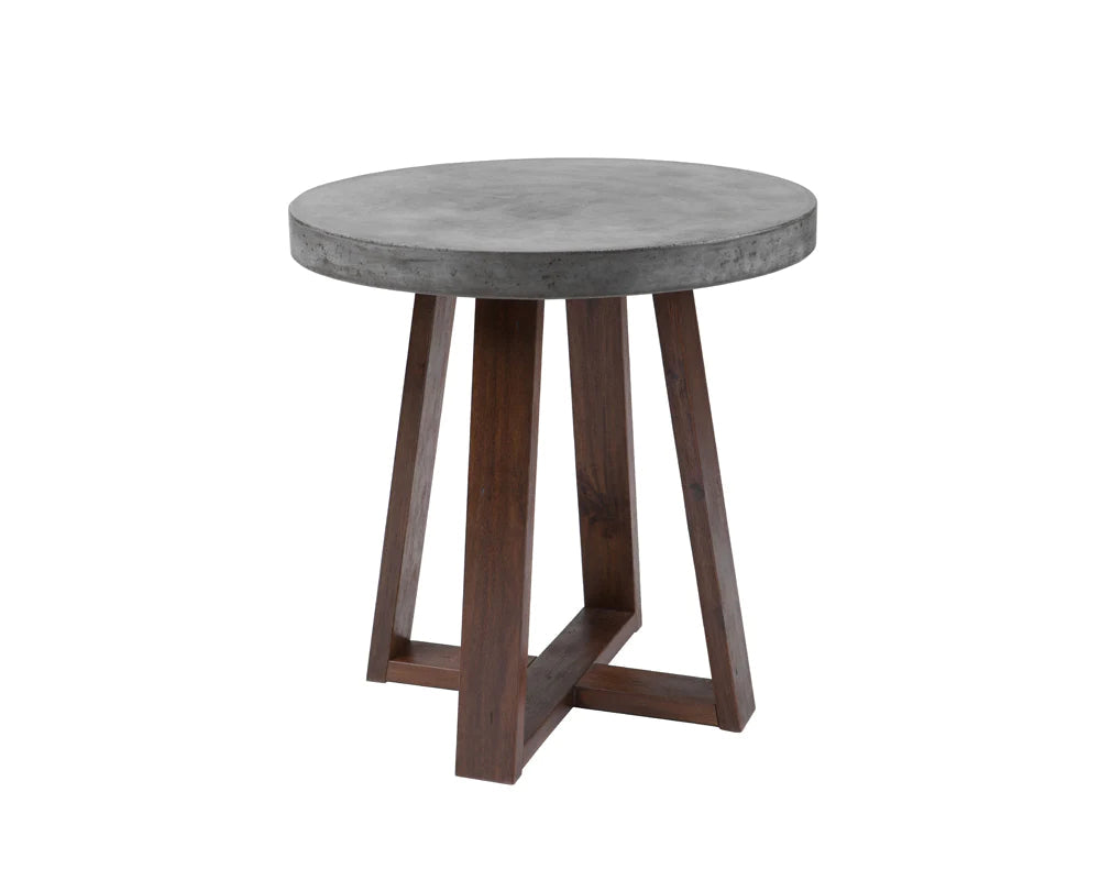 A mix of industrial and rustic design, this end table features a substantial concrete round top and is finished with a light espresso wood base. Crafted from a natural concrete mix, each piece will look different, with variations of hues that will enhance over time.