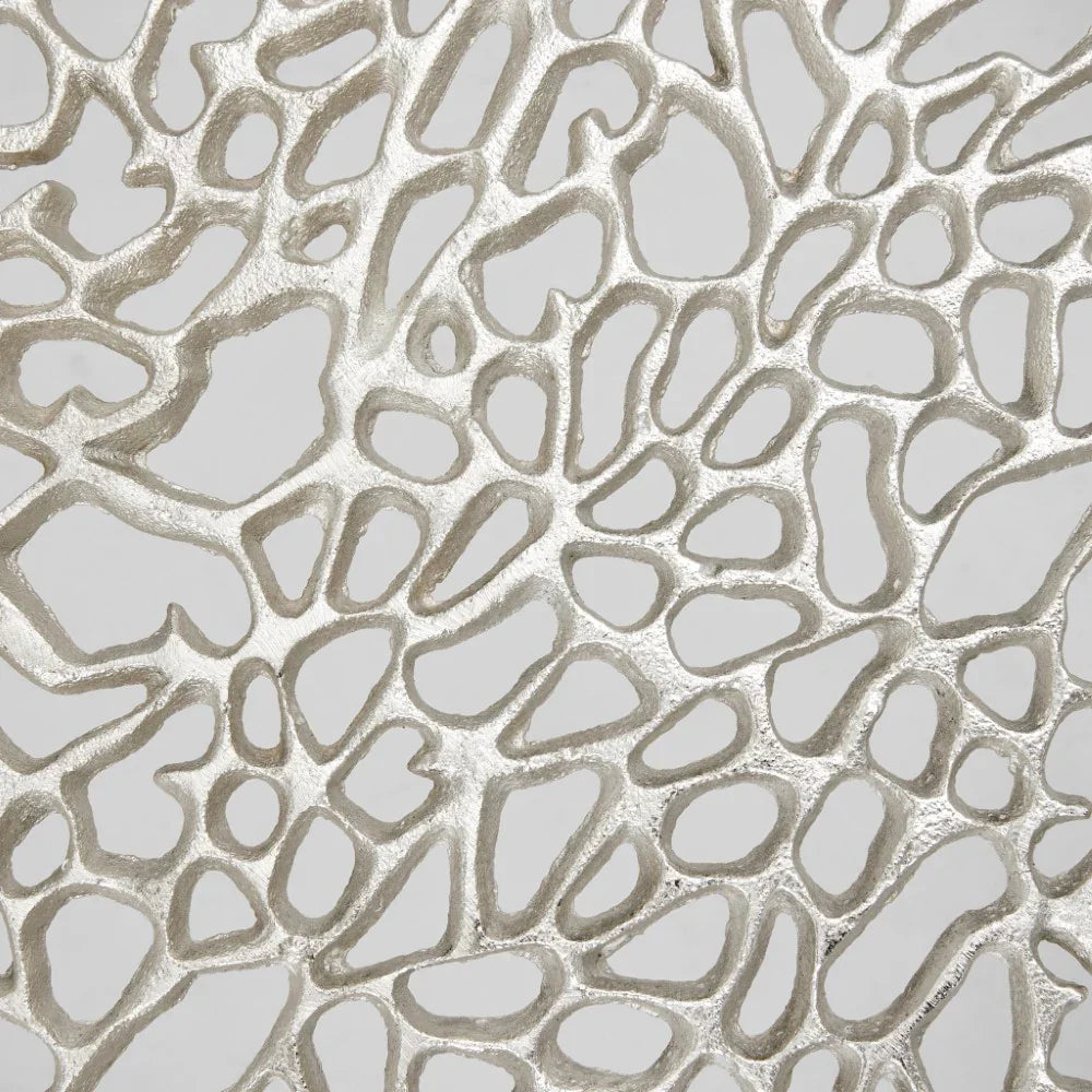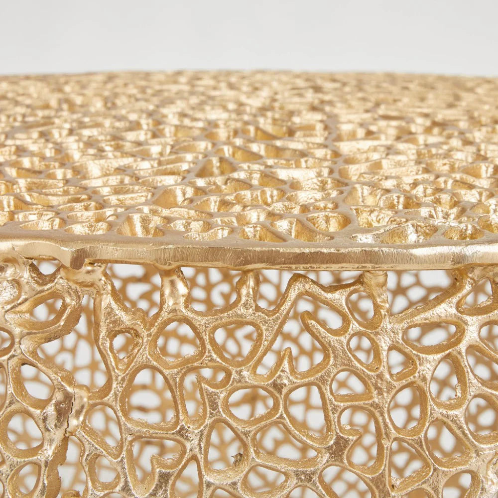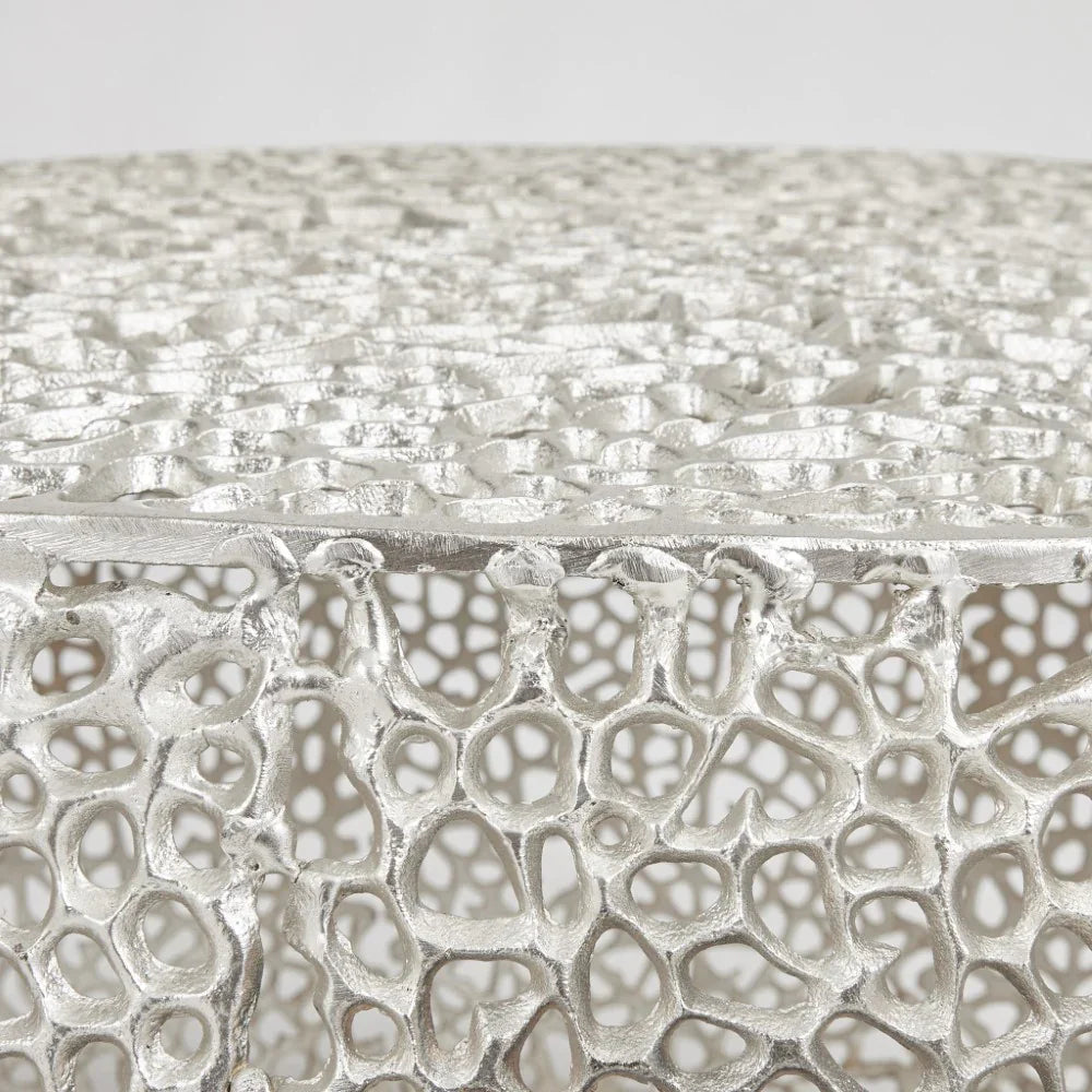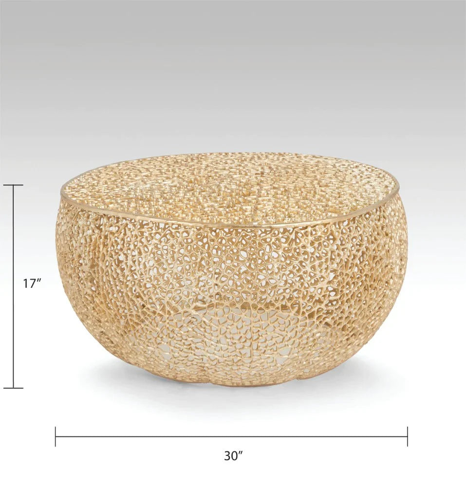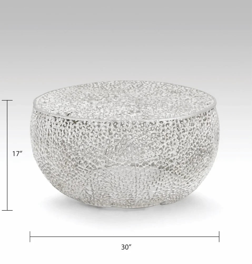 Coffee table with an unique contemporary circular design with a cellular, organic coral pattern. A fun coffee table with a flat top surface to place your favorite decor on, the unique pattern goes around the sides.