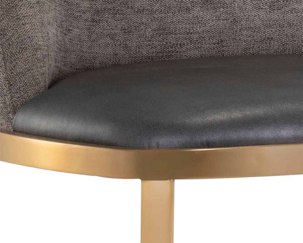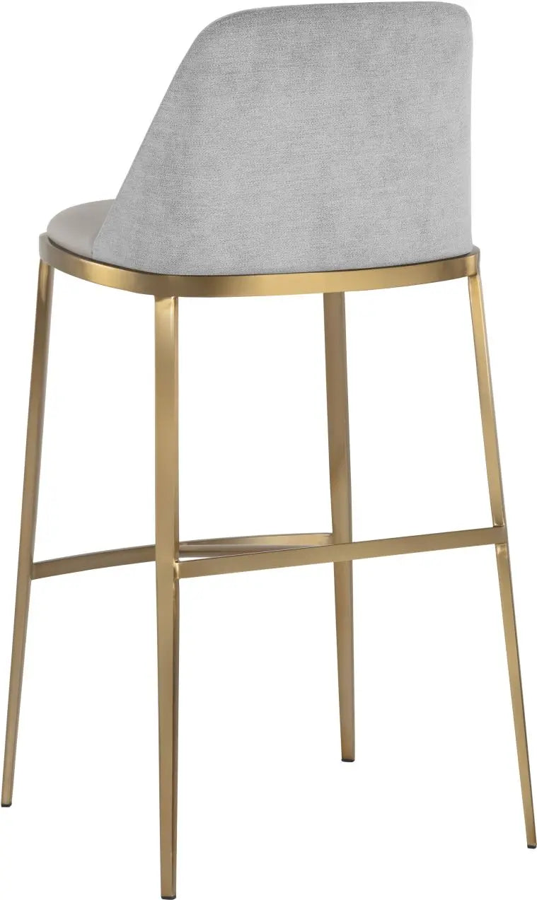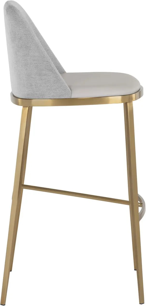 A combination of mixed materials creates a truly luxurious barstool. The contemporary silhouette is finished with a bravo portabella faux leather seat, sparrow grey fabric seatback and sleek brushed gold steel legs. Performance fabric is moisture repellent, stain resistant and easy to clean. An eye-catching piece from all angles. Handle With Care: This design has been crafted with faux leather. Faux leather is manufactured to reflect the natural characteristics of leather; as such, colour variations, markings, wrinkles, grooves, and light scratches are appreciated characteristics. No two pieces will be alike. Visit our Product Care page for more information on how to ensure the lasting beauty of this piece.