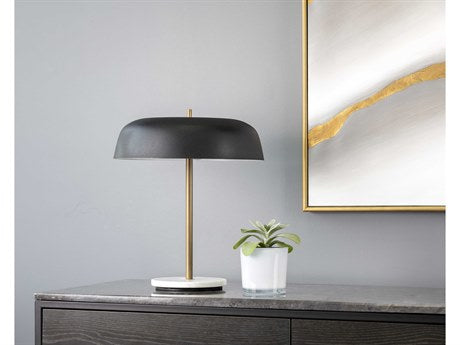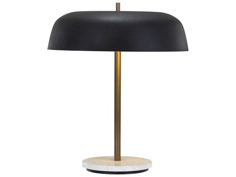 This stylish table lamp features a wide, round shade in matte black iron. An antique brass stem and white marble base complete the look.