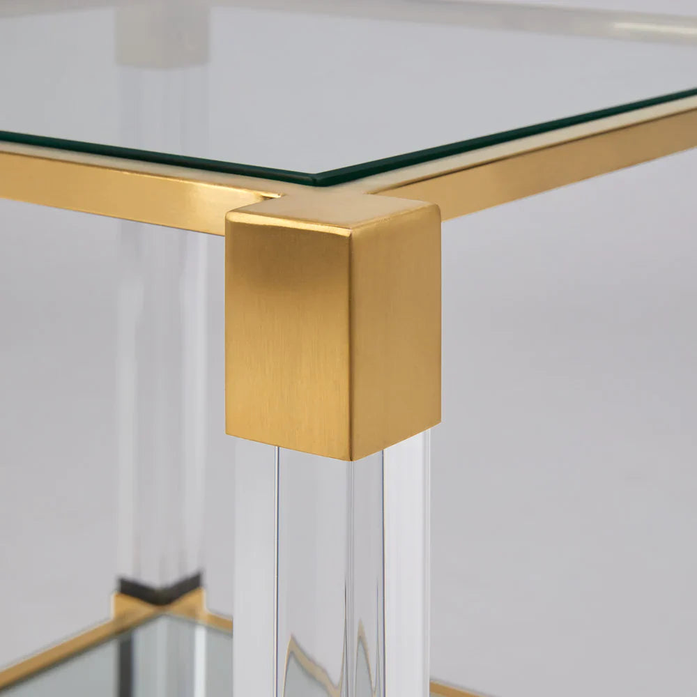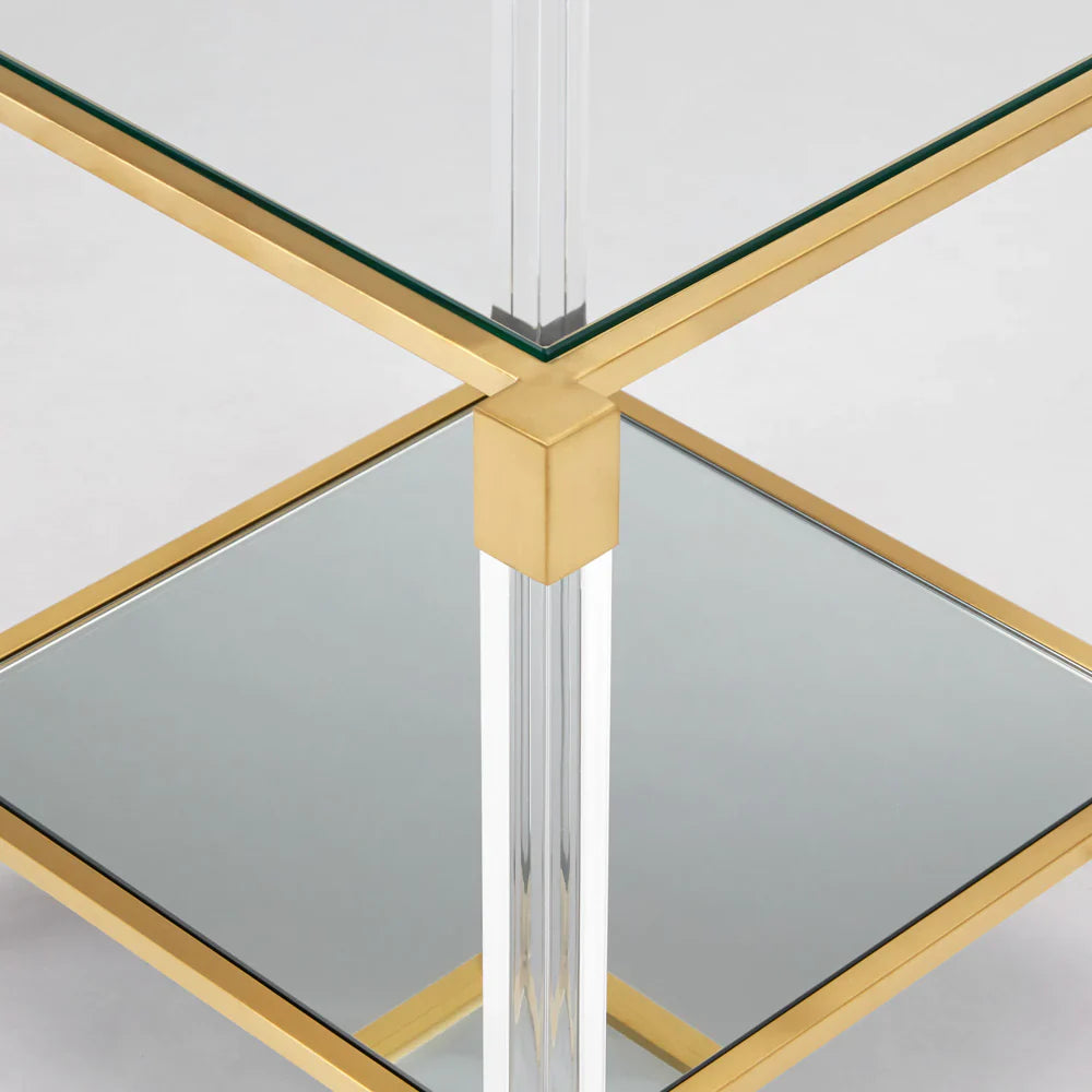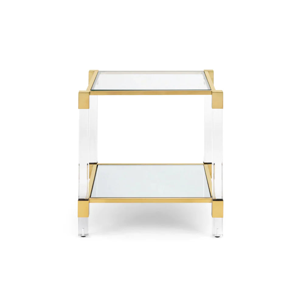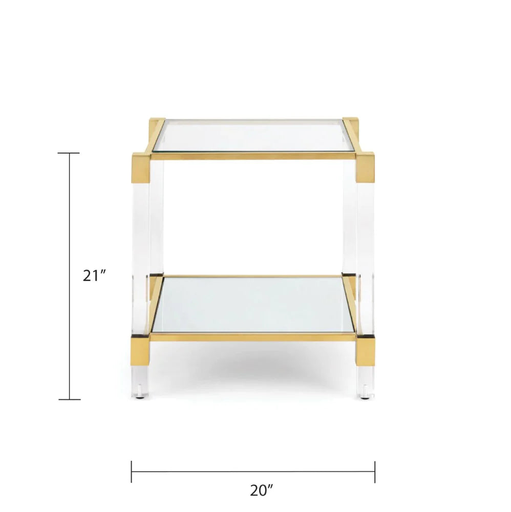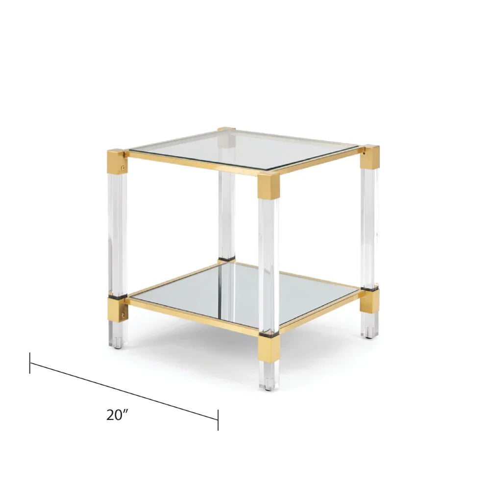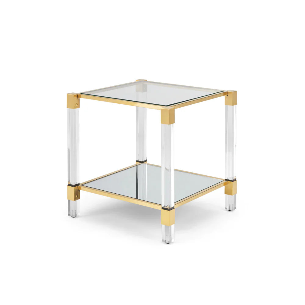 Expertly crafted and with stunning visual appeal, the Dudley end table instantly creates an open and airy vibe. The subtlety of its intricacies brings focus to your accent pieces and overall living space. The robust end table combines acrylic legs, a brushed gold steel frame, a tempered glass top, and a mirror base. Perfectly versatile, the Dudley end table will complement any of your existing decor. Pair it with the matching console and coffee table for a put-together look.