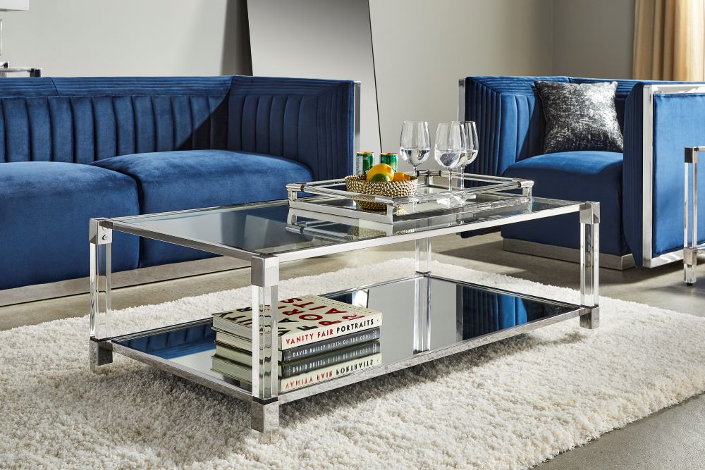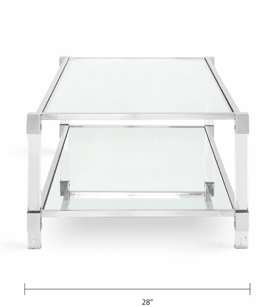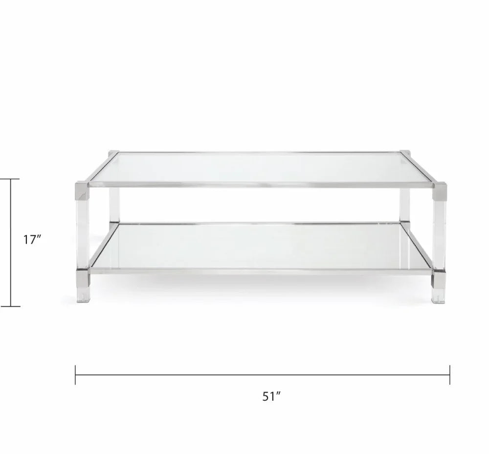 Expertly crafted and with stunning visual appeal, the Dudley coffee table instantly creates an open and airy vibe. The subtlety of its intricacies brings focus to your accent pieces and overall living spaces. The robust coffee table combines acrylic legs, a polished stainless steel frame, a tempered glass top, and a mirror base. Perfectly versatile, the Dudley coffee table will complement any of your existing decors. Pair it with the matching end and console table for a put-together look.