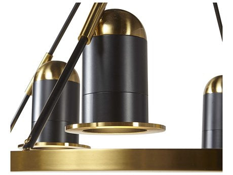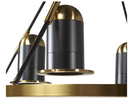 Add drama to any space with this spectacular chandelier. Features four light shades in matte black with antique brass plating, and completed with a large, clear round glass lens.