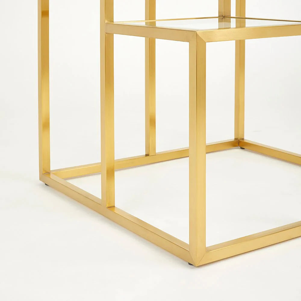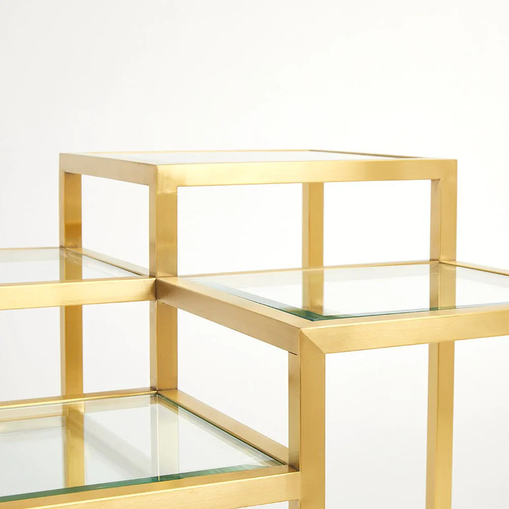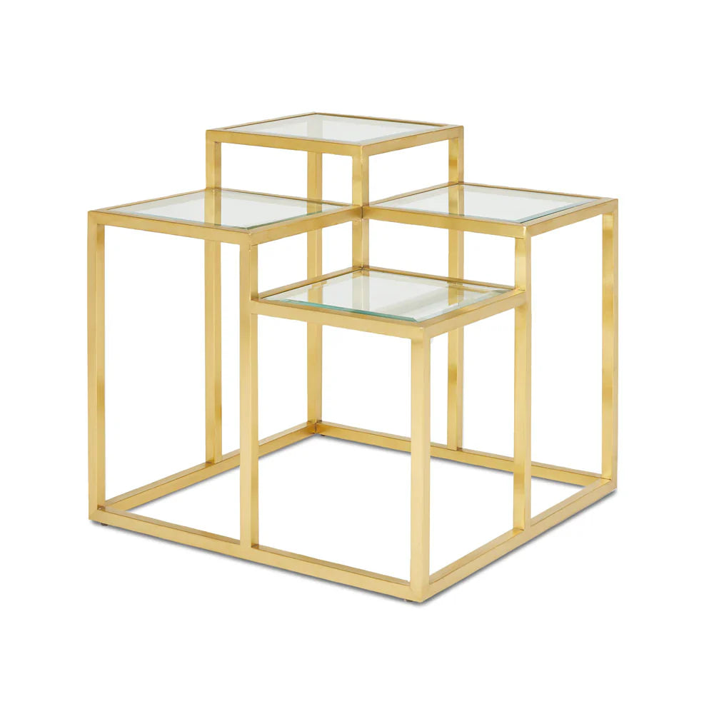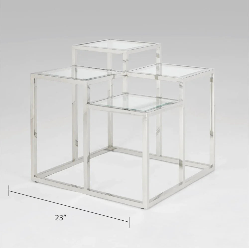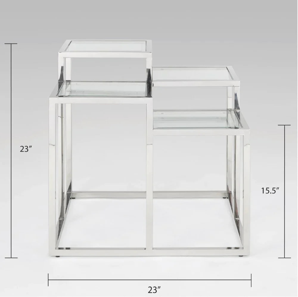 Impressively designed Elmore end table features a striking tiered accent with the tiers fixed in place in a three-dimensional arrangement. The geometric stainless steel base design is accentuated with tempered glass tops, adding a touch of elegance and modern appeal. The multi-tiered structure allows for storage optimization and display space versatility. Use it to display your prized art objects, books, or any home decor accessories. Pair it with the Elmore coffee table to make the perfect living room set.