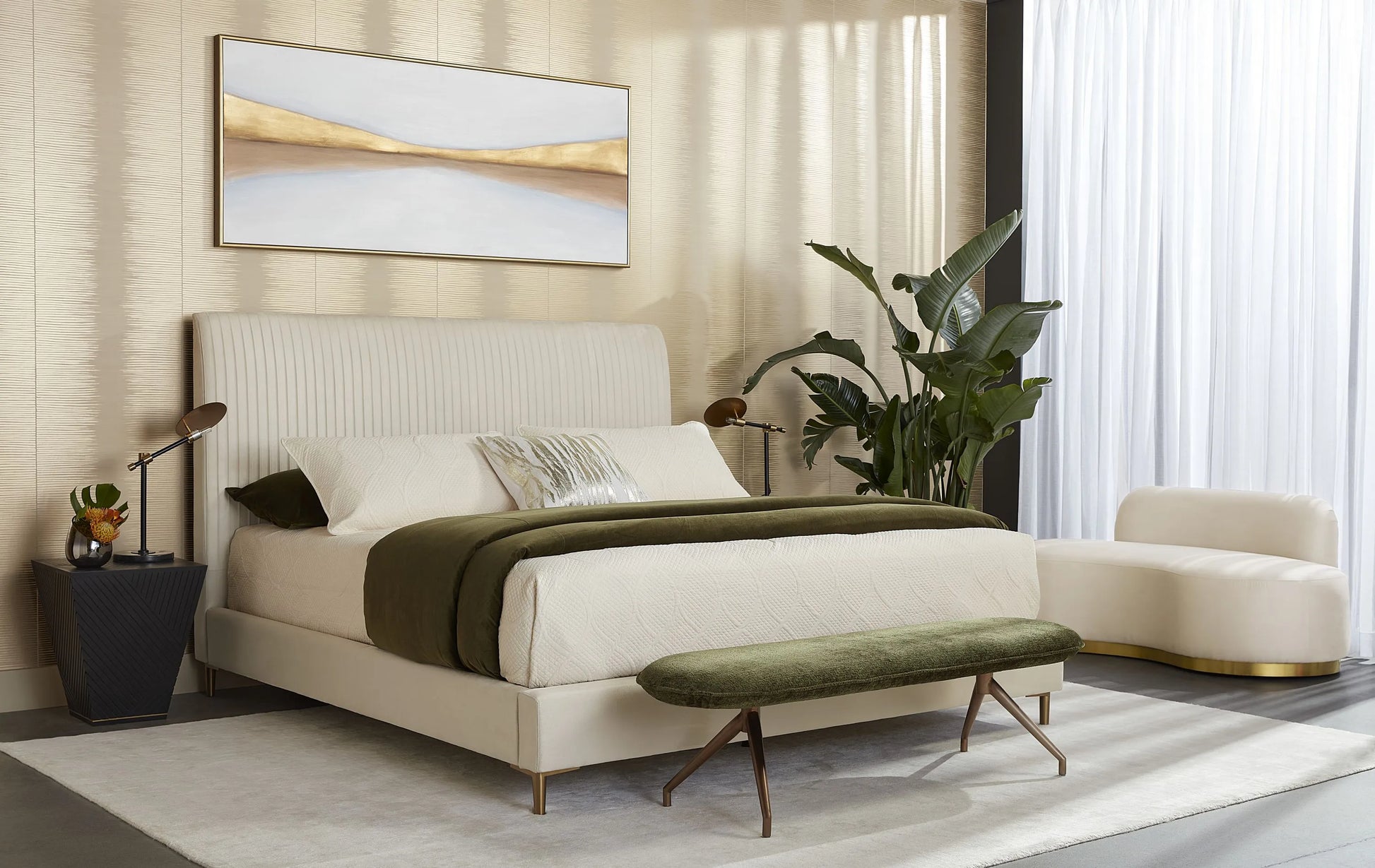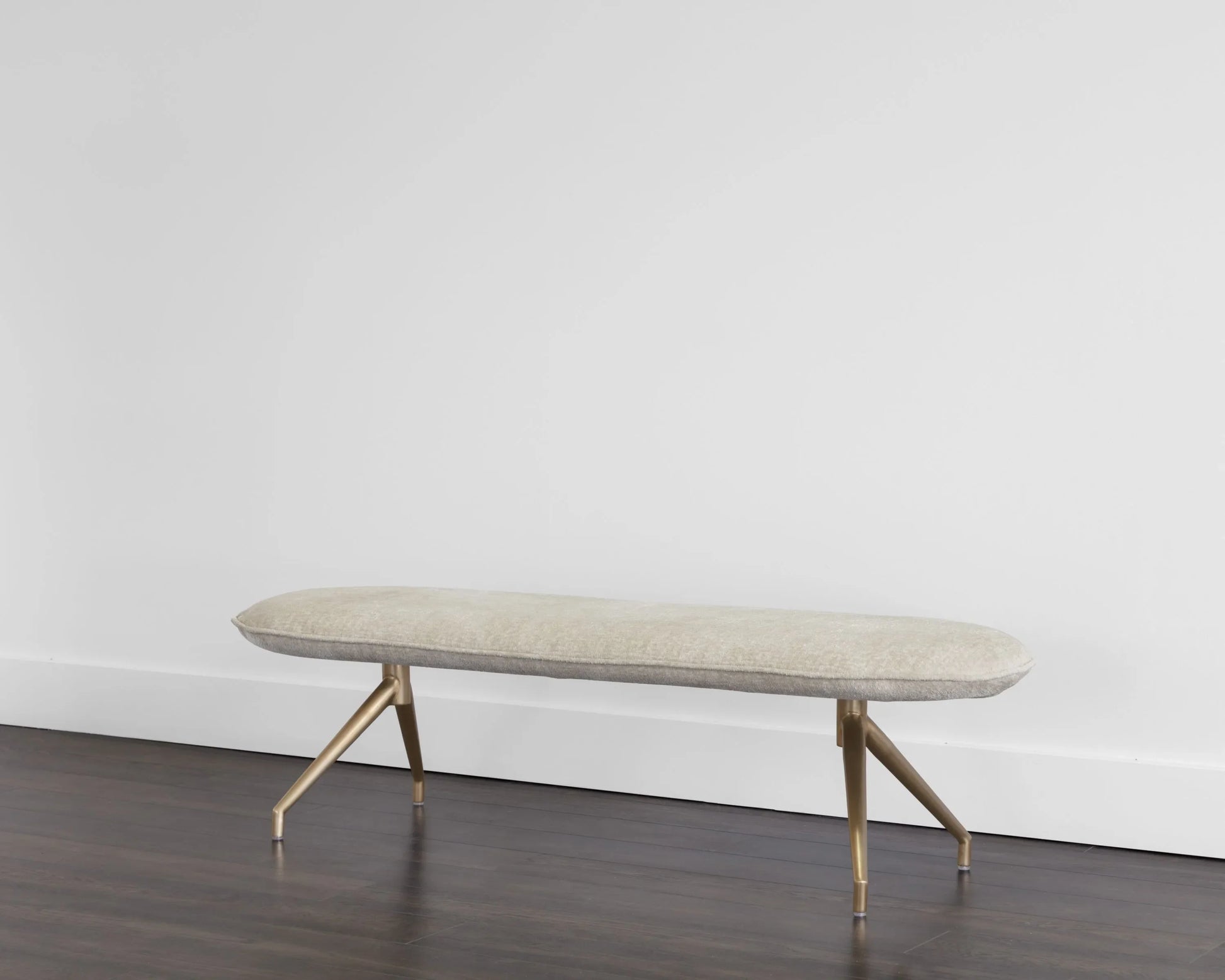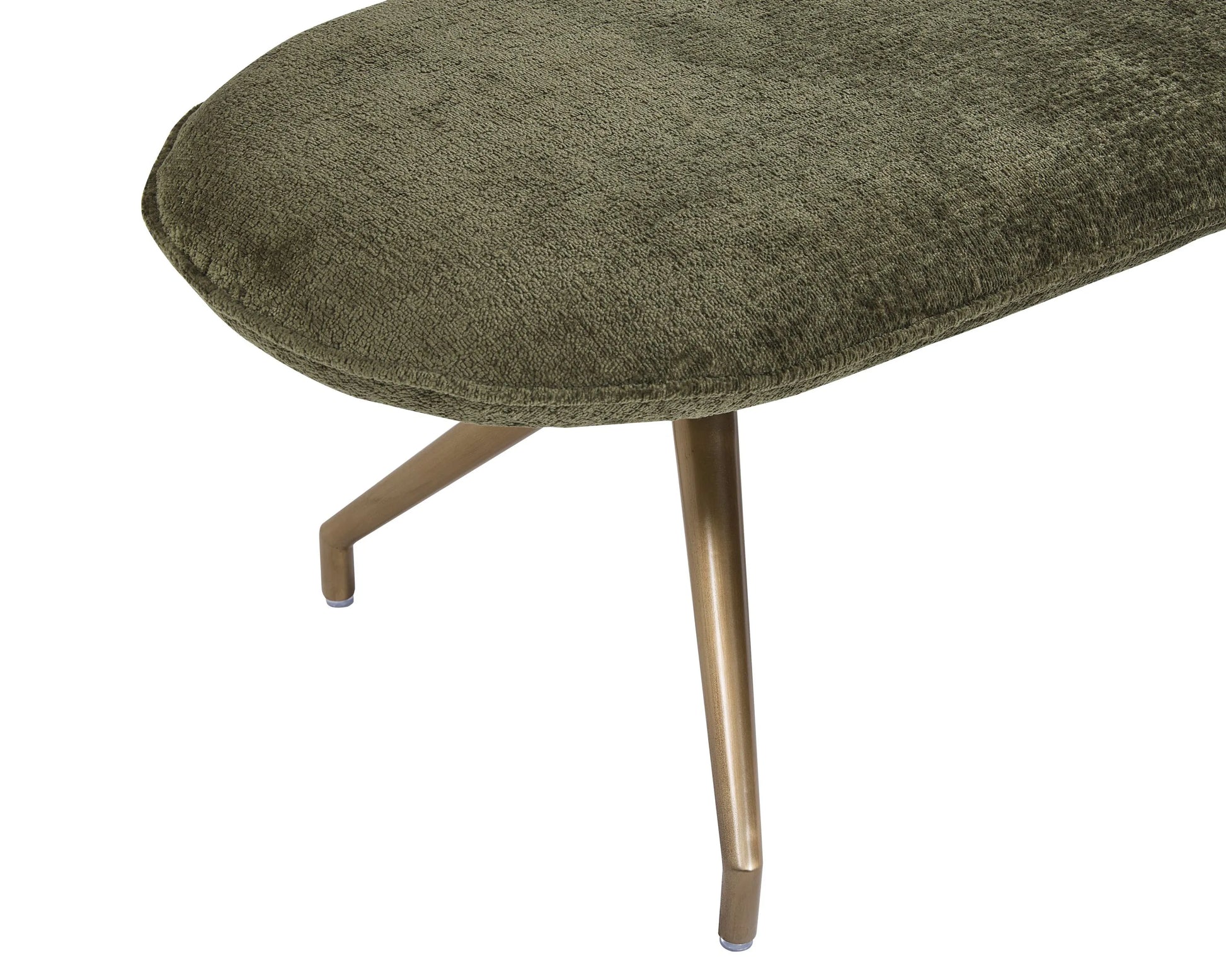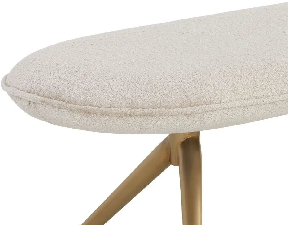 With a stunning oval design, this modern bench will add style and function to any space. Stocked in bergen olive and taupe fabrics, and completed with an antique brass powder coated stainless steel base.