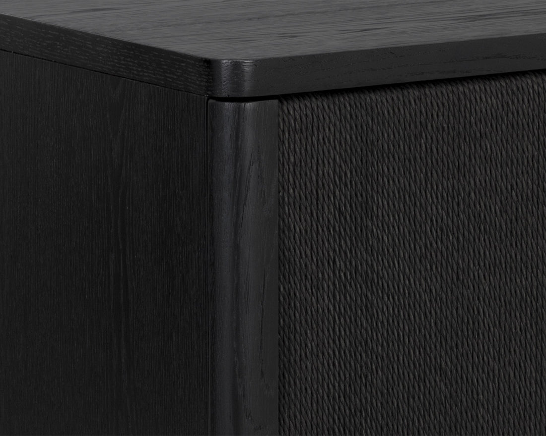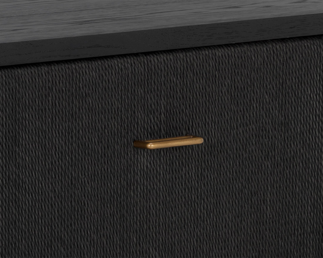 The Etienne Nightstand boasts a linear profile with a moody design. Constructed from a black oak veneer with solid black oak wood legs and a matching rope covering on the doors. Antique brass aluminium handles complement the piece. As wood is an organic, porous material, these pieces will contain natural variation of texture and may also exhibit fine indentations and cracks. Wood pieces will also display a disparity of colour and grain, and visible knots and burls that add to the character of each piece.