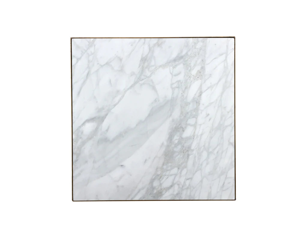 A beautiful modern marble end table. Tabletop features a 1" layer of white Italian marble supported by an antique brass iron frame. As marble is a natural material, unique veining, pitting, fissures, micro-cracks and colour variations are all characteristics that add to the uniqueness and beauty of each piece.