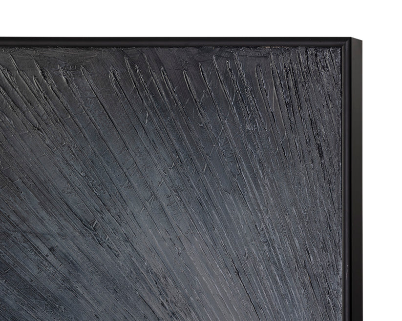 This dramatic hand painted image expresses a breathtaking explosion of light and darkness. Bold lines create an etched-look for a uniquely textured canvas. Features a black finished wood floater frame.