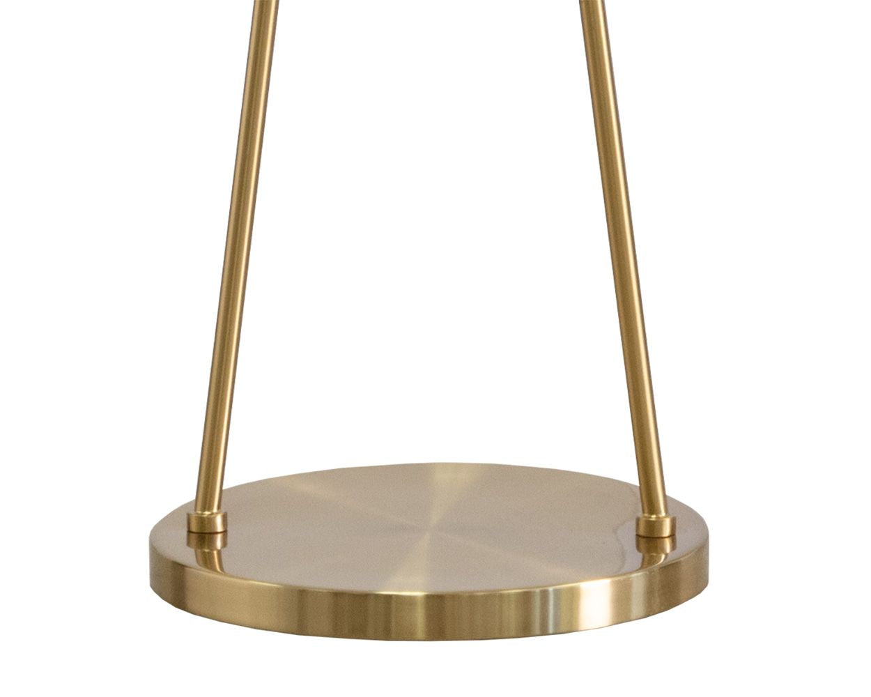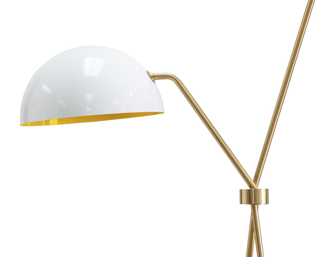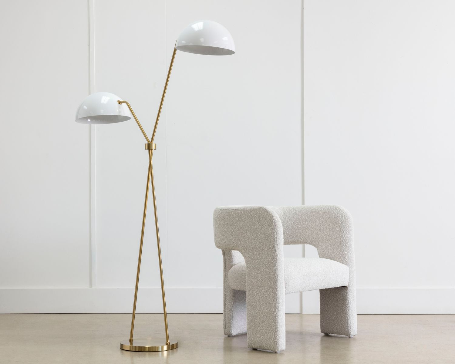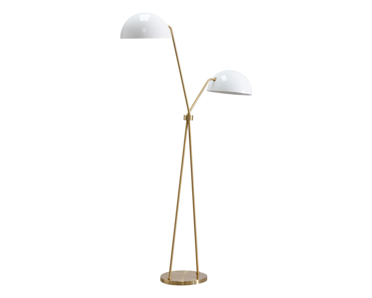 Modern illumination is defined in this dual-domed floor lamp. Features a sturdy powder-coated black iron base with two sleek poles of varying heights crossed together with a brass iron ring. Black lamp shades complete the look. Also available in a white colour.