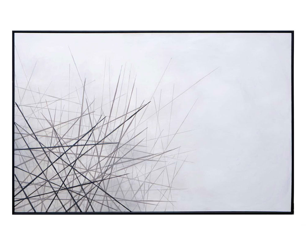 Needle-like lines in this dramatic, greyscale painting command attention and creates visual movement. Can be placed both vertically or horizontally. Features a black floater frame. Each artwork is hand-painted and will feature slight variations that make every piece unique.