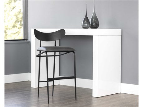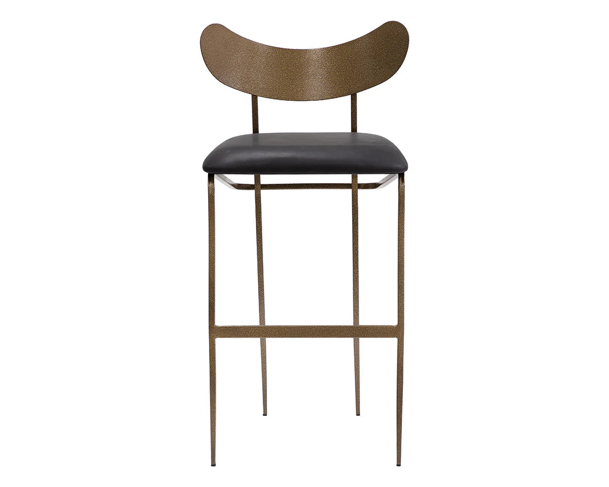 A unique mid-century modern inspired barstool crafted in India. Features a seat in 100% genuine charcoal black leather with a sculpted seatback and frame in antique brass iron. With refined craftsmanship, this design was brought to life by skilled local artisans in India. By nature, these materials develop unique imperfections such as fissures, markings and colour variations for a truly one-of-a-kind piece. Suitable for various dining spaces of all sizes. Handle with Care: This design has been crafted with 100% genuine leather. Leather is a natural material; as such, colour variations, markings, wrinkles, grooves and light scratches are acceptable and appreciated characteristics. No two pieces are alike. Visit our Product Care page for more information on how to ensure the lasting beauty of this piece.