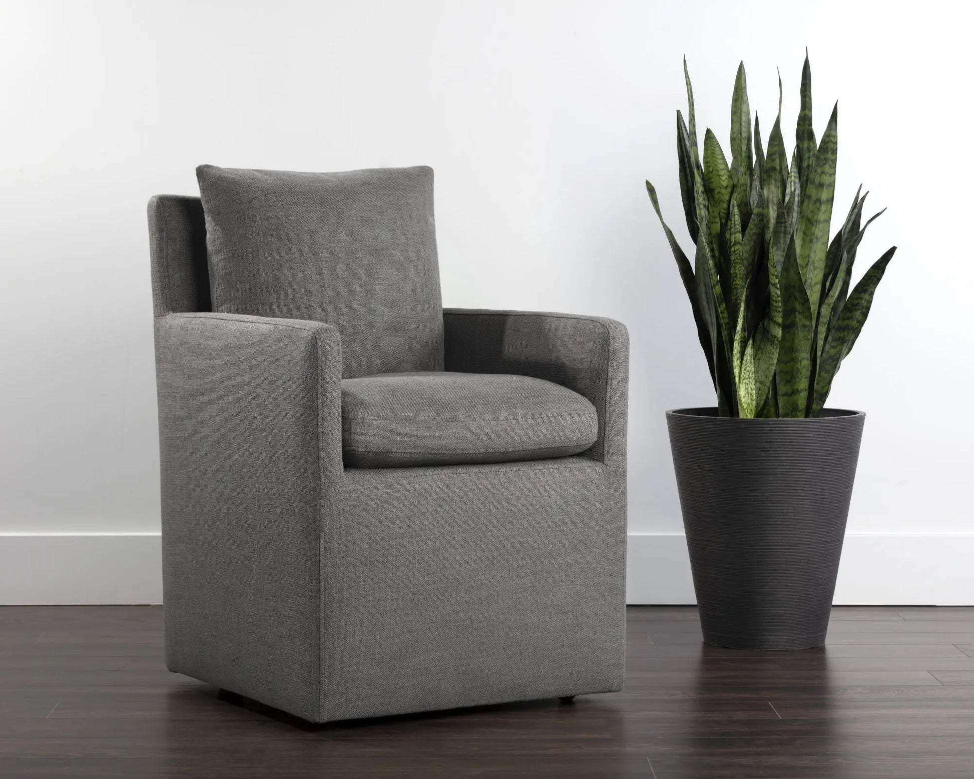 A formal and comfortable wheeled dining armchair that is full of classic appeal. Stocked in effie linen and smoke fabrics. Also available in an armless dining chair version.