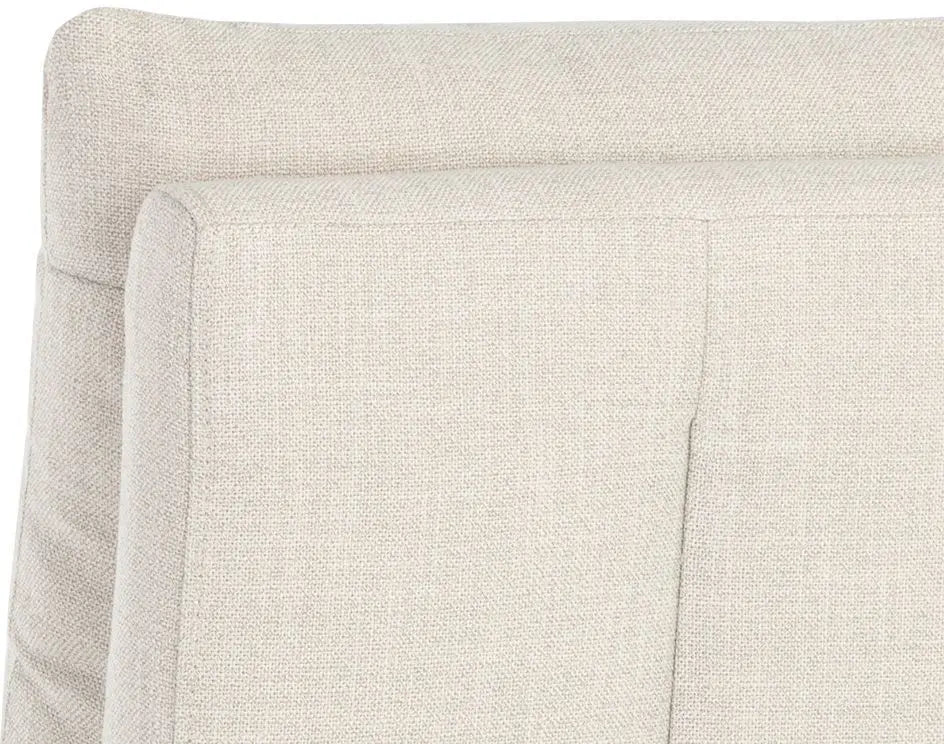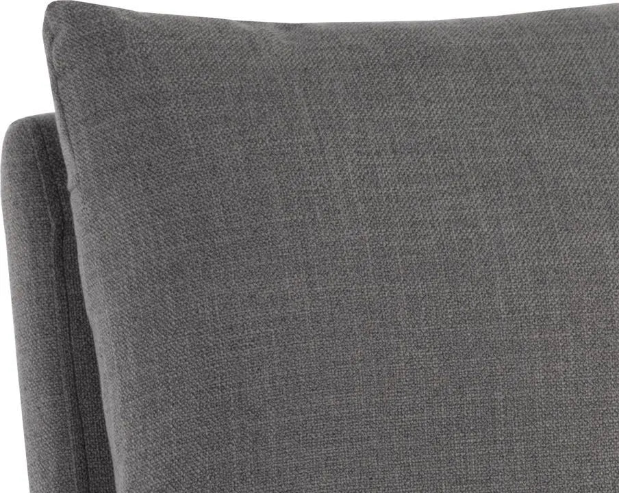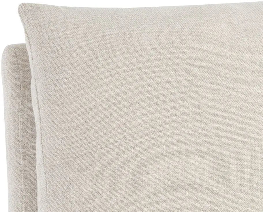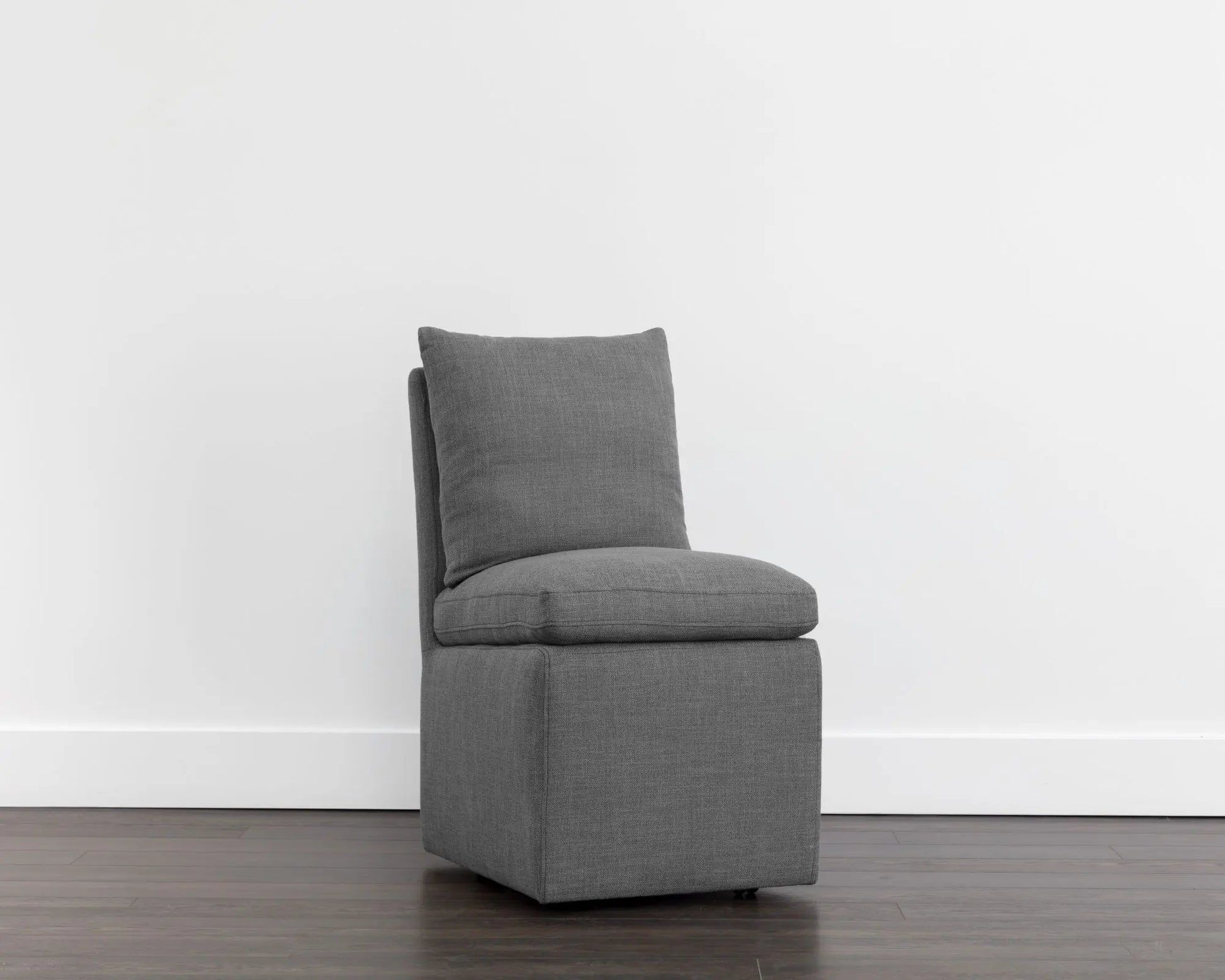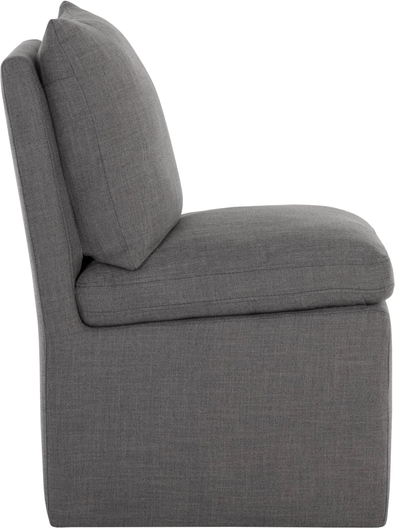 A formal and comfortable wheeled dining chair that is full of classic appeal. Stocked in effie linen and smoke fabrics. Also available in an armrest dining chair version.