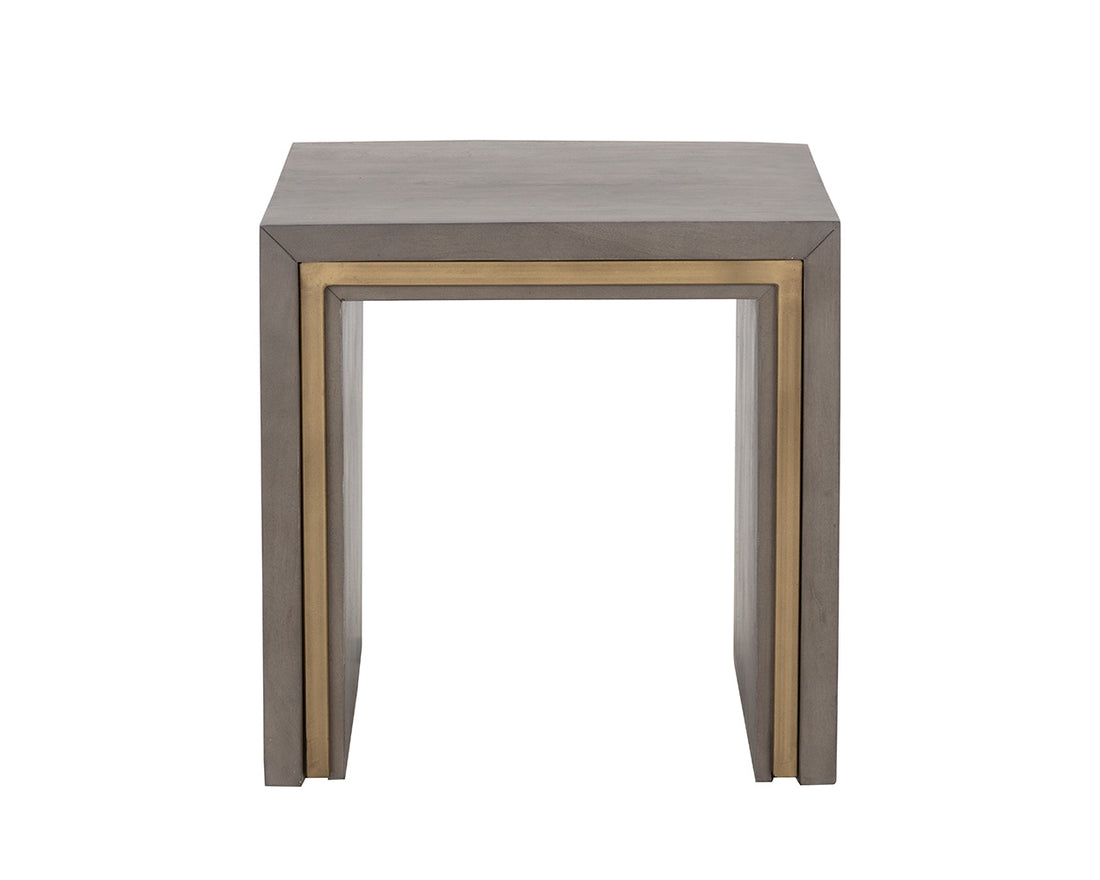The Hilbert End Table is grounded in a functional modern design. Crafted from grey acacia wood, this console table features a sharp linear silhouette. A brass iron trim on the front and the back of the piece provides added dimension and intrigue to the overall look. As wood is an organic, porous material, these pieces will contain natural variations of texture and may also exhibit fine indentations and cracks. Wood pieces will also display a disparity of colour and grain, and visible knots and burls that add to the character of each piece.