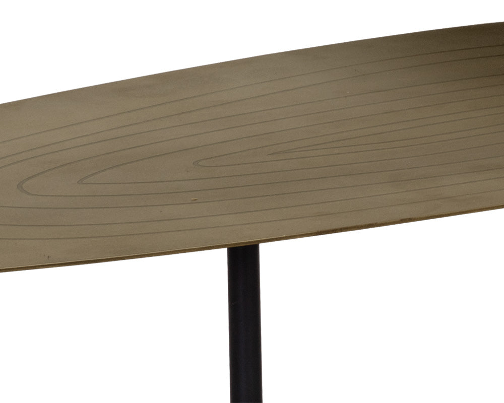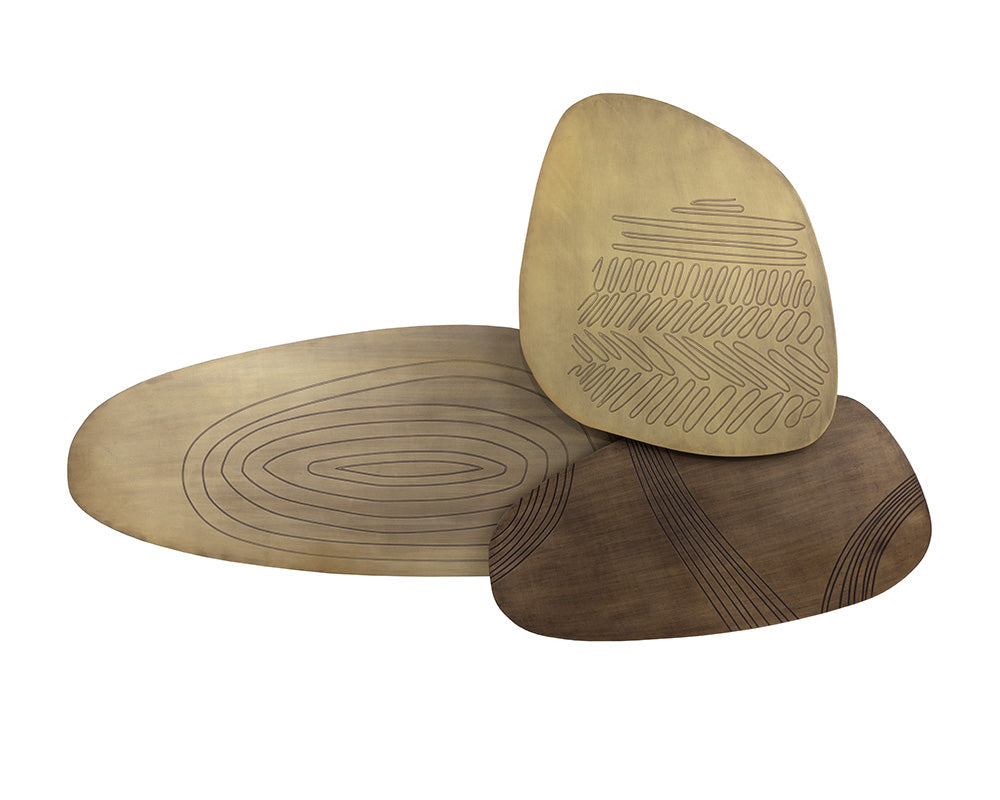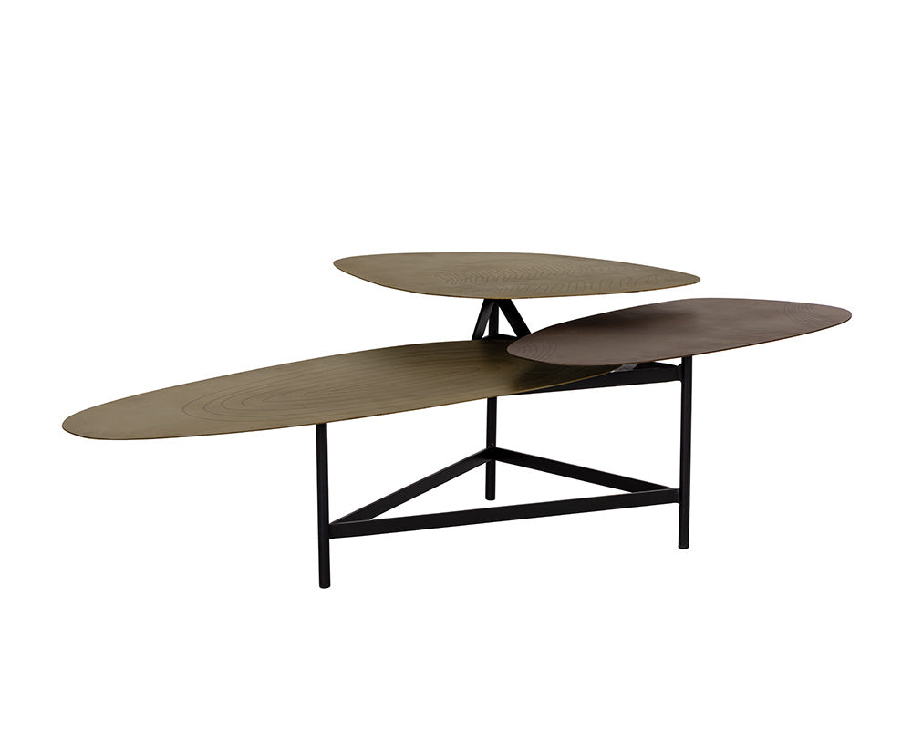 A marvelous coffee table with a head-turning contemporary design. Features a three-tiered table top in antique brass, bronze and warm bronze metal finishes with unique patterning. Completed with a black metal base. Made in India. With refined craftsmanship, this design was brought to life by skilled local artisans. By nature, these materials develop unique imperfections such as fissures, markings and colour variations for a truly one-of-a-kind piece.