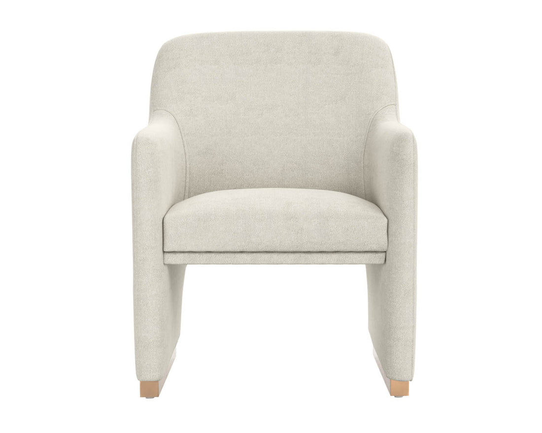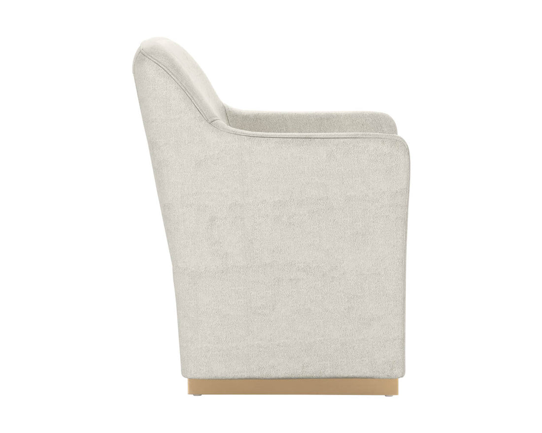 Make a bold statement with this spectacular dining armchair that will elevate any dining space. Stocked in fior vanilla fabric and completed with a gold stainless steel base. Also available in meg dark emerald and ash fabrics.