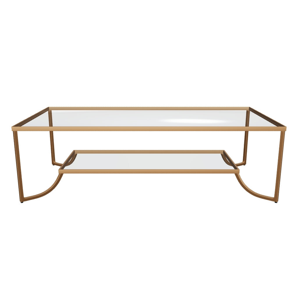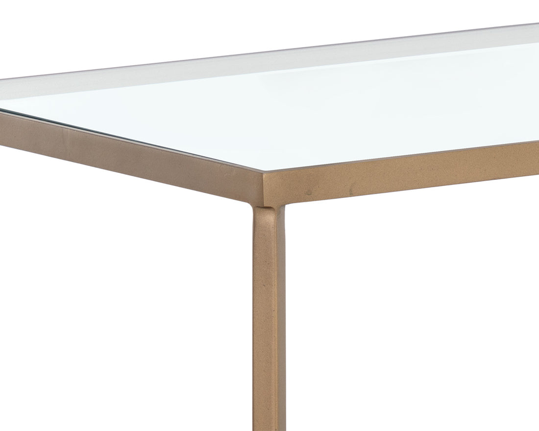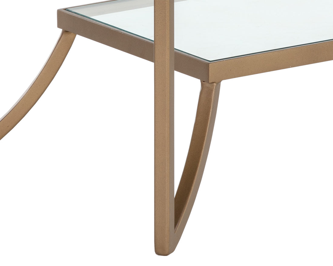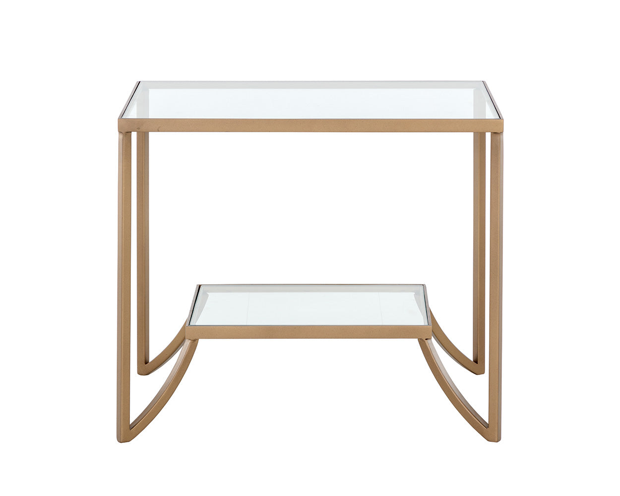 The Kessler End Table features a minimal yet elegant profile. Artfully crafted from powder-coated antique gold iron with a clear tempered glass top and bottom shelf. Coordinating book case also available.