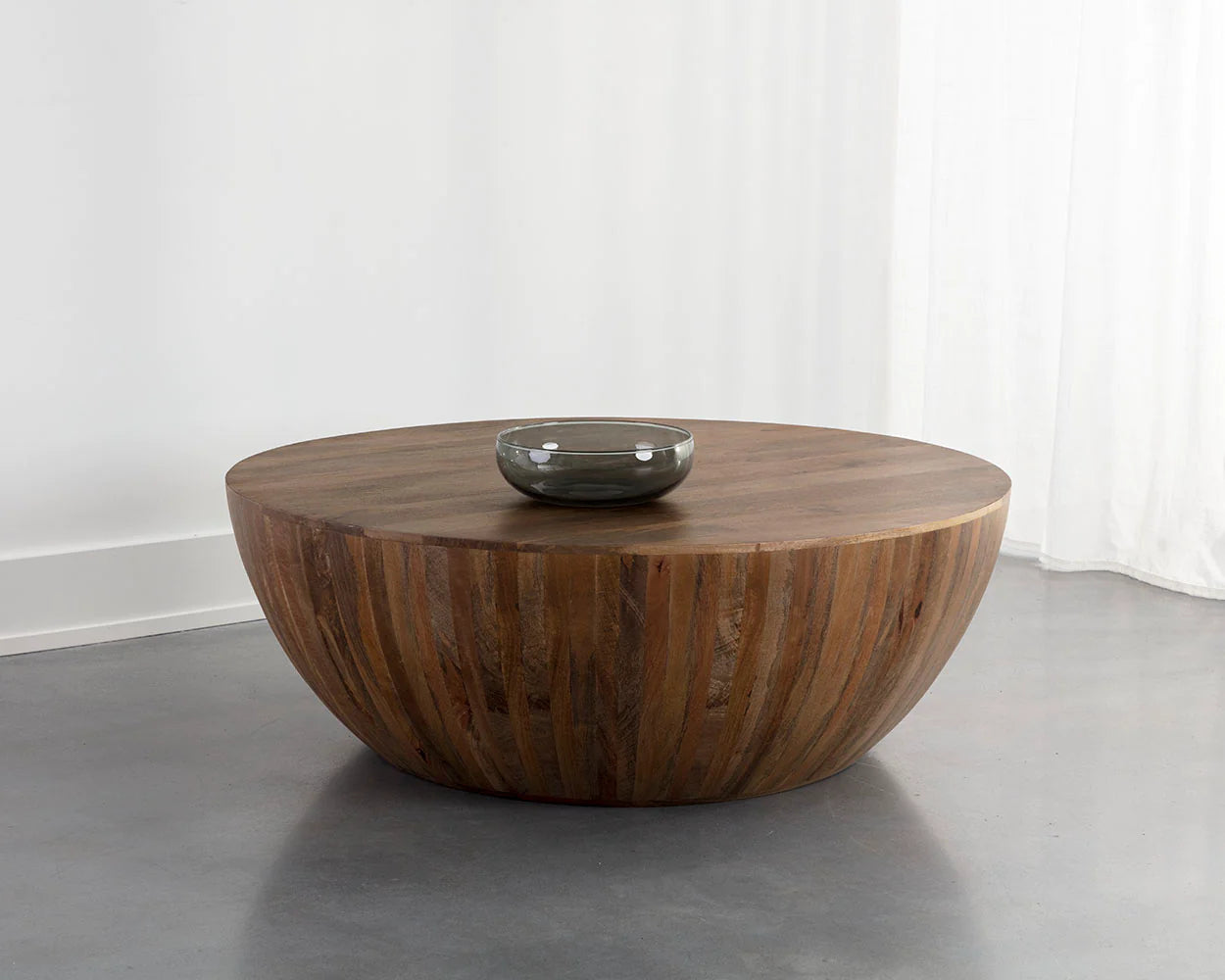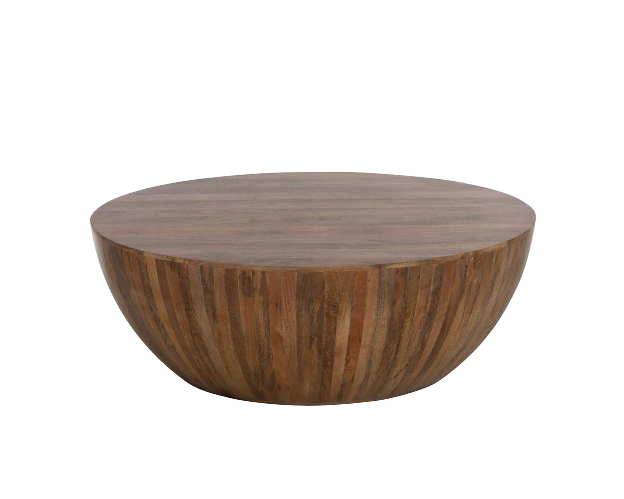 Inspired by global travels, this, round, handcrafted large drum-style coffee table will certainly add wonder to any space. Made from grey solid mango wood. Also available in a natural finish. Small version also available. Made in India. With refined craftsmanship, this design was brought to life by skilled local artisans. By nature, these materials develop unique imperfections such as fissures, markings and colour variations for a truly one-of-a-kind piece. As wood is an organic, porous material, these pieces will contain natural variation of texture and may also exhibit fine indentations and cracks. Wood pieces will also display a disparity of colour and grain, and visible knots and burls that add to the character of each piece.