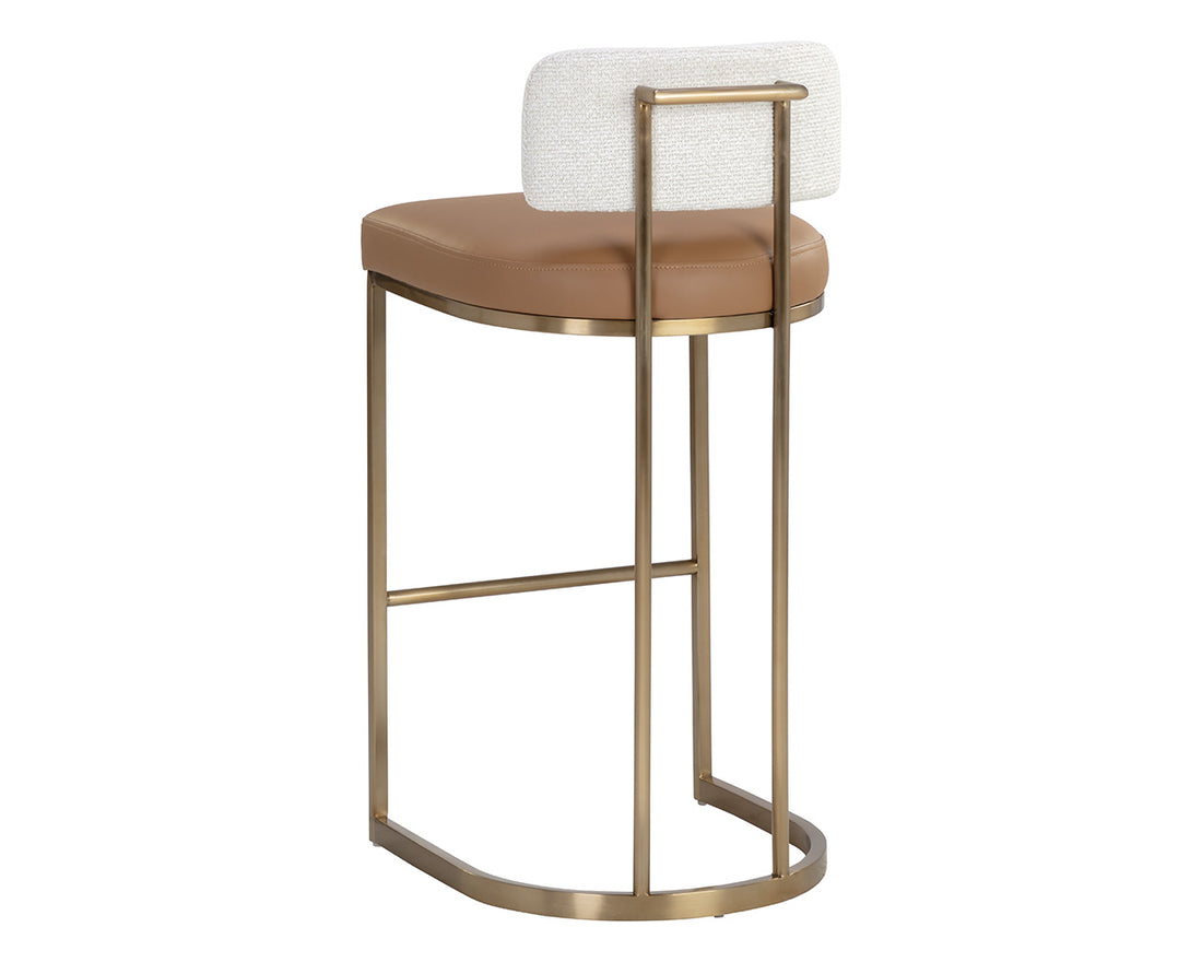The Larissa Barstool brings together a beautiful display of mixed materials. A low seatback upholstered in rhea light barley fabric contrasts the warm tones of the seat upholstered in napa cognac faux leather for an elevated aesthetic. The antique brass stainless steel frame features a handle on the back for a functional and stylish addition. Handle With Care: This design has been crafted with faux leather. Faux leather is manufactured to reflect the natural characteristics of leather; as such, colour variations, markings, wrinkles, grooves, and light scratches are appreciated characteristics. No two pieces will be alike. Visit our Product Care page for more information on how to ensure the lasting beauty of this piece.