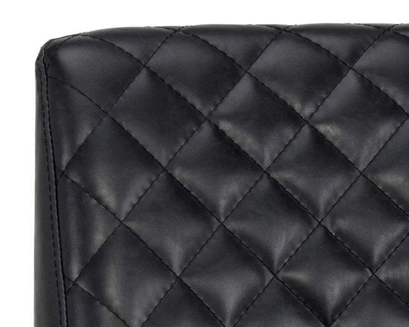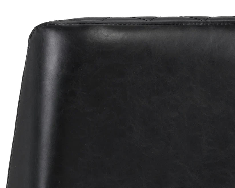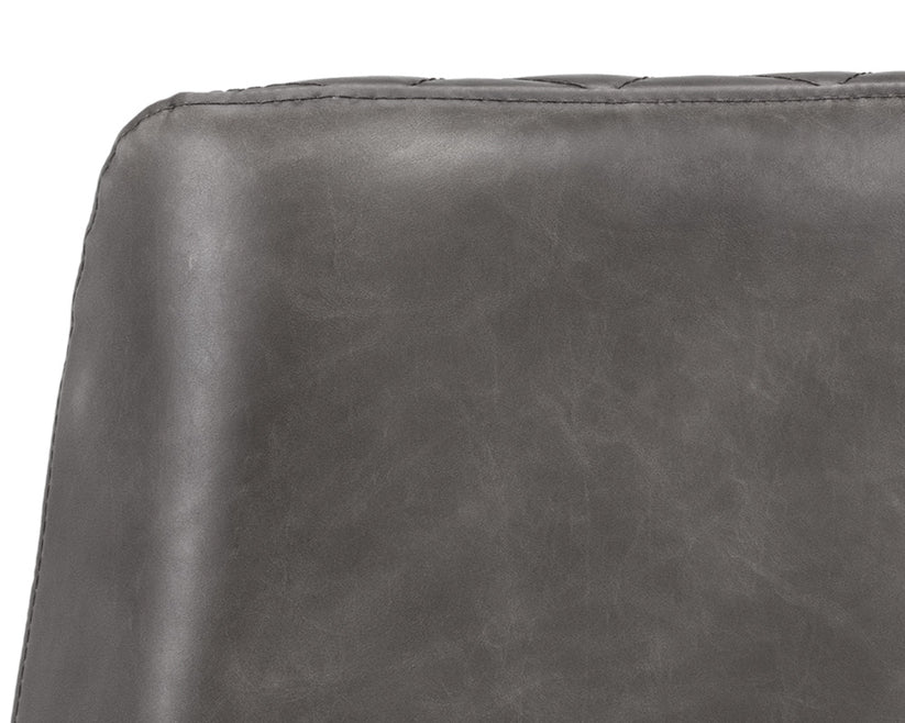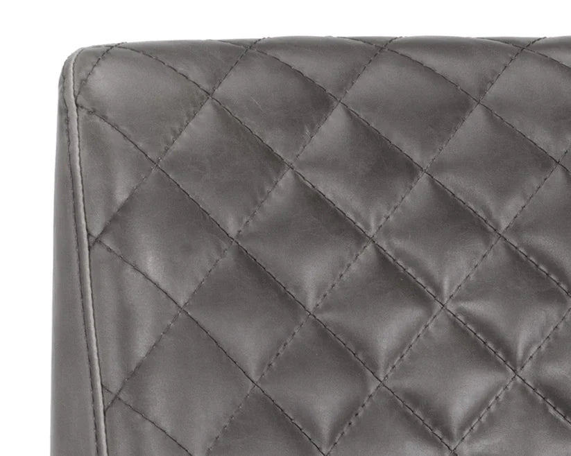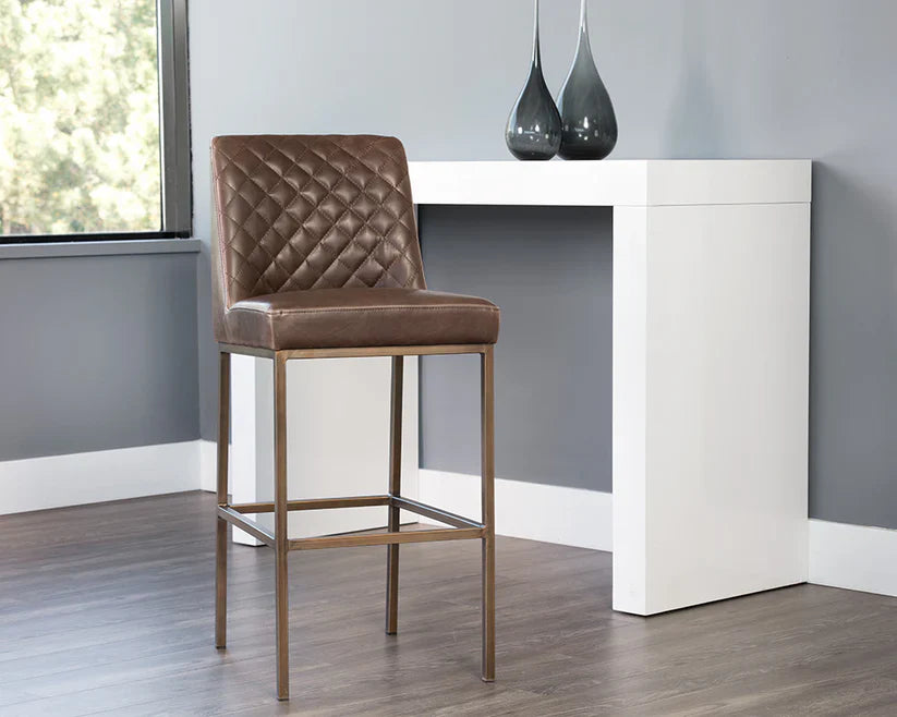 Transform bar and dining spaces with this classic barstool. Stocked in light and dark grey fabric and havana dark brown, coal grey and overcast grey faux leather with diamond stitching on the interior seat back and an antique brass frame steel frame. Suitable for various dining, kitchen and bar spaces of all sizes. Handle With Care: This design has been crafted with faux leather. Faux leather is manufactured to reflect the natural characteristics of leather; as such, colour variations, markings, wrinkles, grooves, and light scratches are appreciated characteristics. No two pieces will be alike. Visit our Product Care page for more information on how to ensure the lasting beauty of this piece.