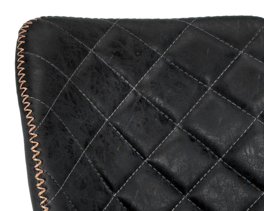 A chic and comfortable dining chair. Features beautiful diamond tufting and stylish zig-zag stitching on the seatback. Stocked in antique grey or brown faux leather with brushed black steel legs. Also available in antique black faux leather with brushed champagne gold steel legs. Handle With Care: This design has been crafted with faux leather. Faux leather is manufactured to reflect the natural characteristics of leather; as such, colour variations, markings, wrinkles, grooves, and light scratches are appreciated characteristics. No two pieces will be alike. Visit our Product Care page for more information on how to ensure the lasting beauty of this piece.