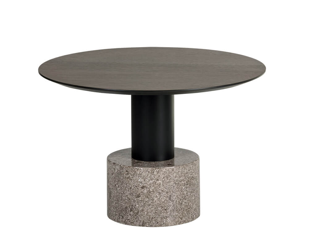 This coffee table offers a modern look with an organic feel. Features a substantial light grey marble and dark grey iron base with a raw umber finished oak veneer top. Also available with a light grey marble and brushed gold iron base with a charcoal grey finished oak veneer top. Pair with matching end table for added dimension. As marble is a natural material, unique veining, pitting, fissures, micro-cracks and colour variations are all characteristics that add to the uniqueness and beauty of each piece.