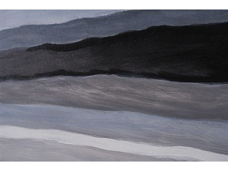 Layers of cool blue, grey and black tones in this painting evoke a sense of exploring a mountainous terrain. Features a black finished wood floater frame.