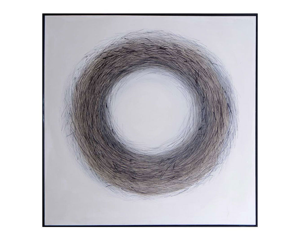 This eye-catching painting commands attention as the hair-like brushstrokes form an elaborate ring. Install multiple for dramatic effect. Features a black floater frame. Each artwork is hand-painted and will feature slight variations that make every piece unique.